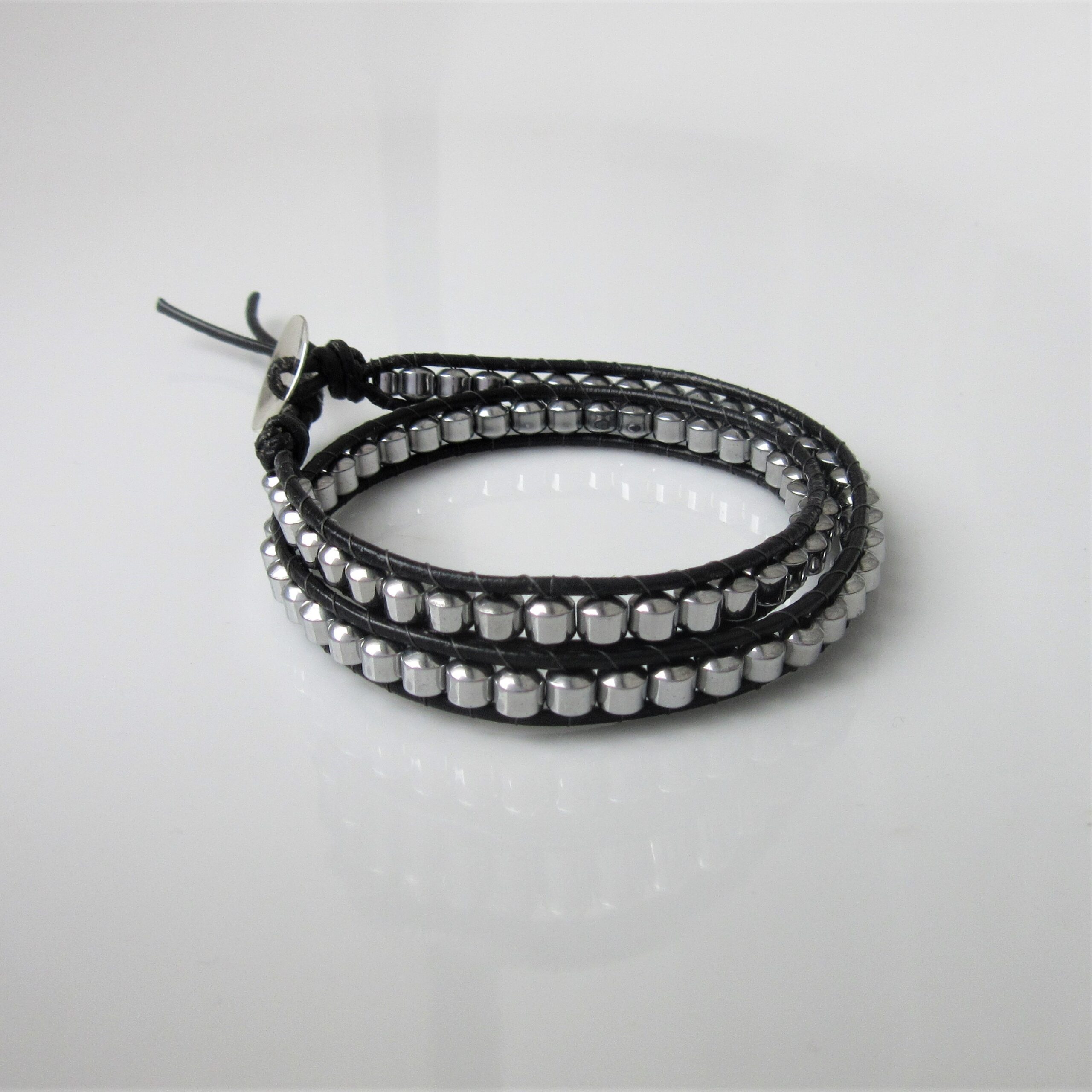 An explosion of colors, positivity and individuality, presented in the form of this amazing Silver Aura double wrap bracelet. What makes our wraps completely unique are their materials and strength. We use genuine semi-precious stones called Hematite, enhanced with a brilliant color-changing Aura surface that catches even the smallest rays of light, lending mesmerizing sparkle to your every move. The stone is also well known for its powerful antidepressant and protective properties. The clasp can either be Sterling Silver or a metal alloy, giving you the choice of high-quality materials or fashion on a budget! Combined with genuine leather and an especially resistant type of cord connecting the pieces, this show-stopping accessory is not only gorgeous but also uniquely resistant. It can be worn every day or as a finishing touch for a night out, but once you get your hands on one you won’t have the heart to take it off.