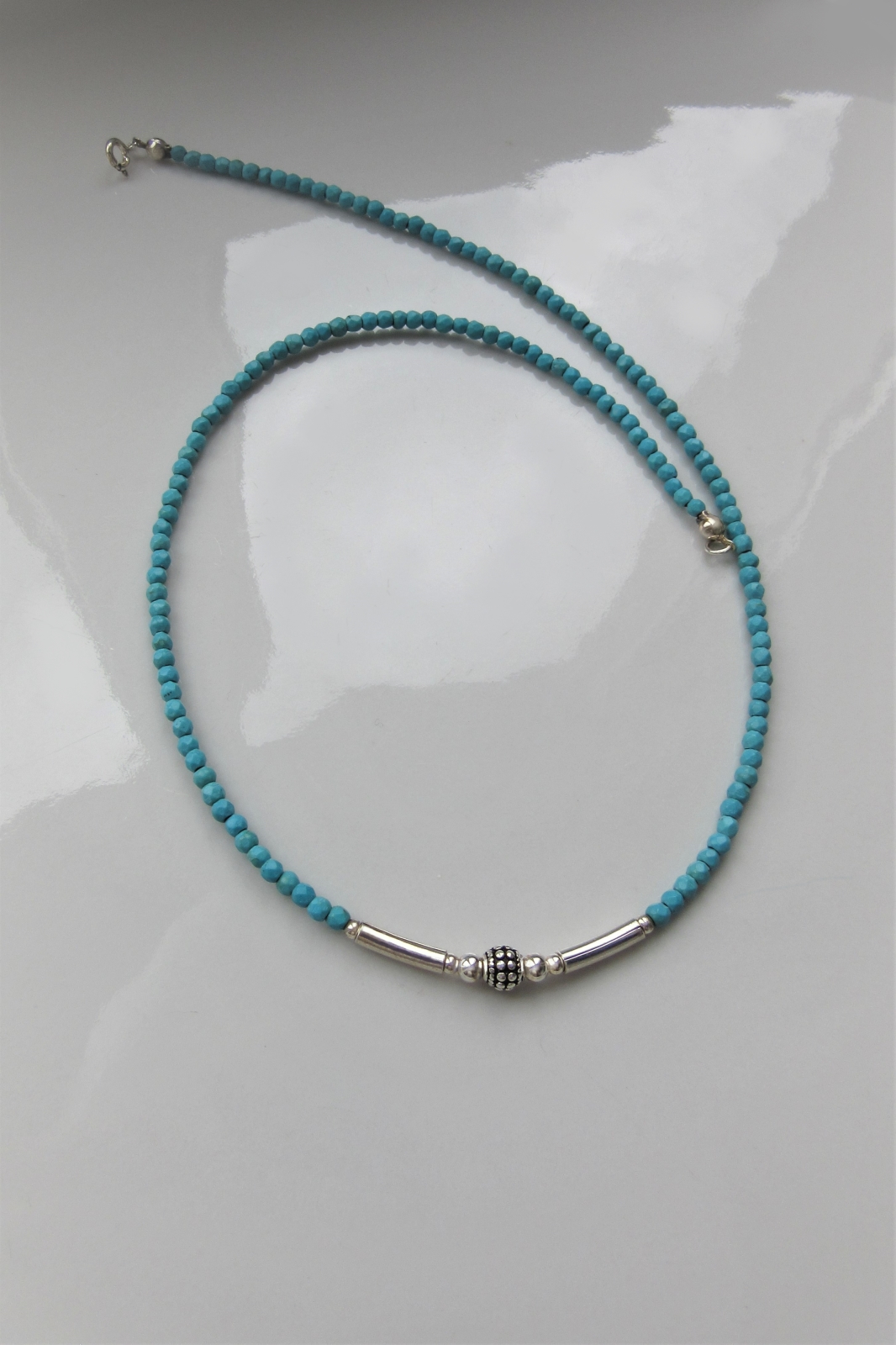 This elegant necklace features a string of delicately shimmering faceted Turquenite beads in a rich sky blue hue. At the center is placed a glittering Balinese bead surrounded by Sterling Silver rods to add casual sophistication to the piece. Simple yet eye catching, this necklace would be a lovely addition to your everyday jewelry repertoire.