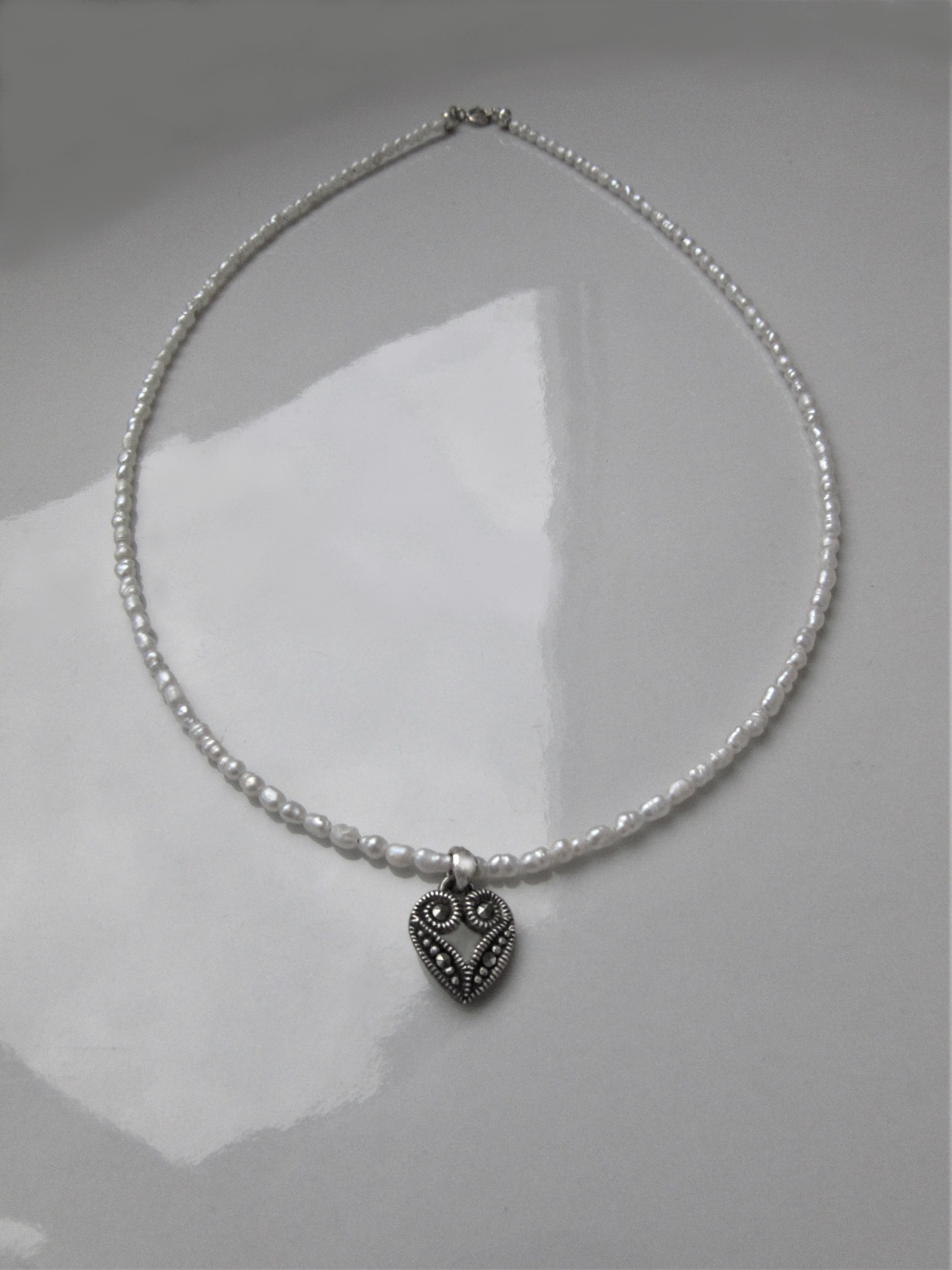 As delicate as snowflakes, this lovely string of miniature Kurasu white Pearls embodies pure dainty elegance. Swaying romantically from these glistening beads is a charming, beautifully embellished Sterling Silver heart pendant encrusted with glittering Marcasites. An absolutely adorable piece, designed to delight and bring a smile upon your face.