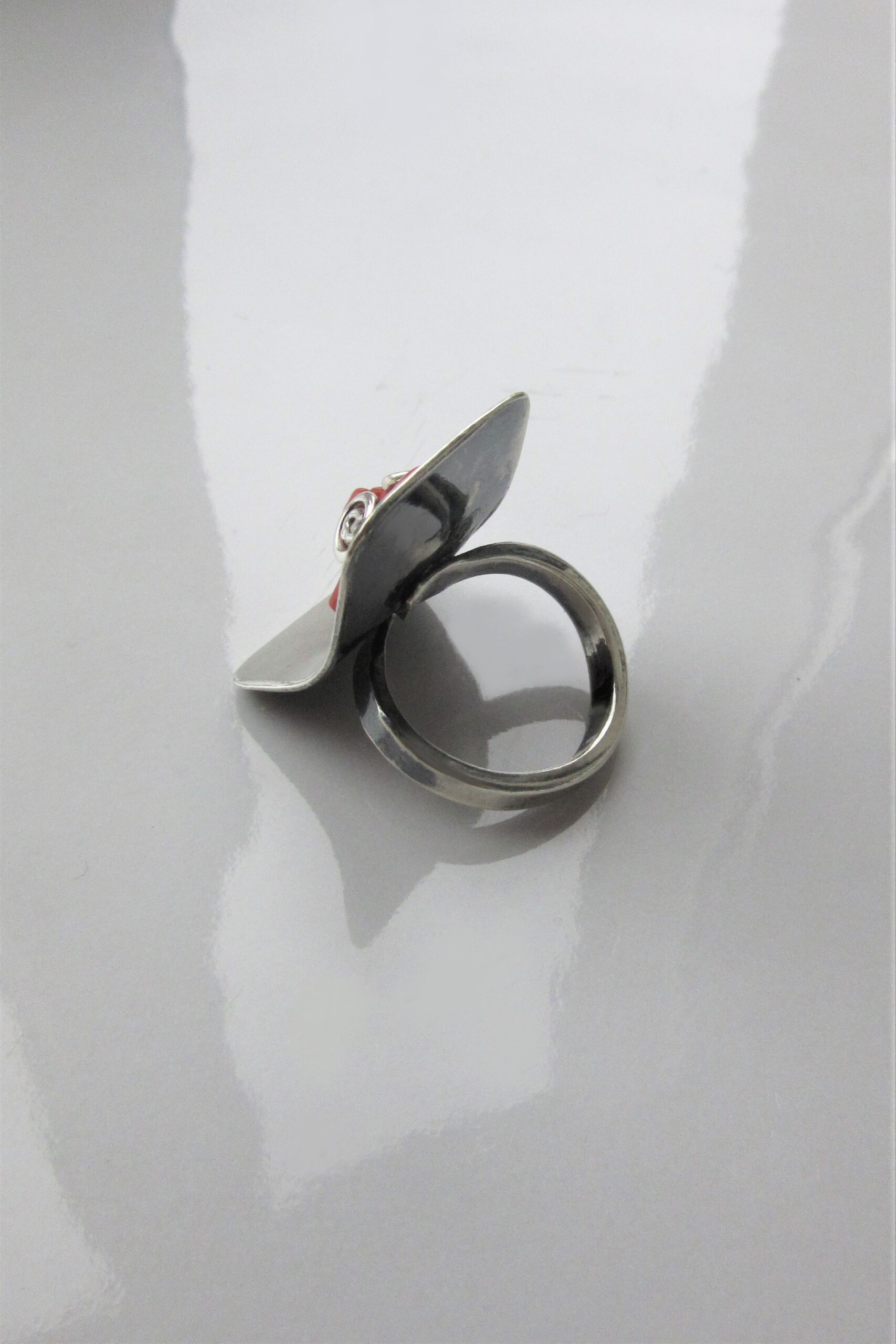 An interestingly bent Sterling Silver base gives this handcrafted statement ring a modern touch. The gleaming surface of the Silver stands juxtaposed to the unrefined surface of the vibrant, raw Adriatic Coral piece featured in the center. Three Silver swirls tightly grasp the Coral, serving as mediators between the sterile and the crude. This unique piece serves as a perfect contemporary finish to any outfit.