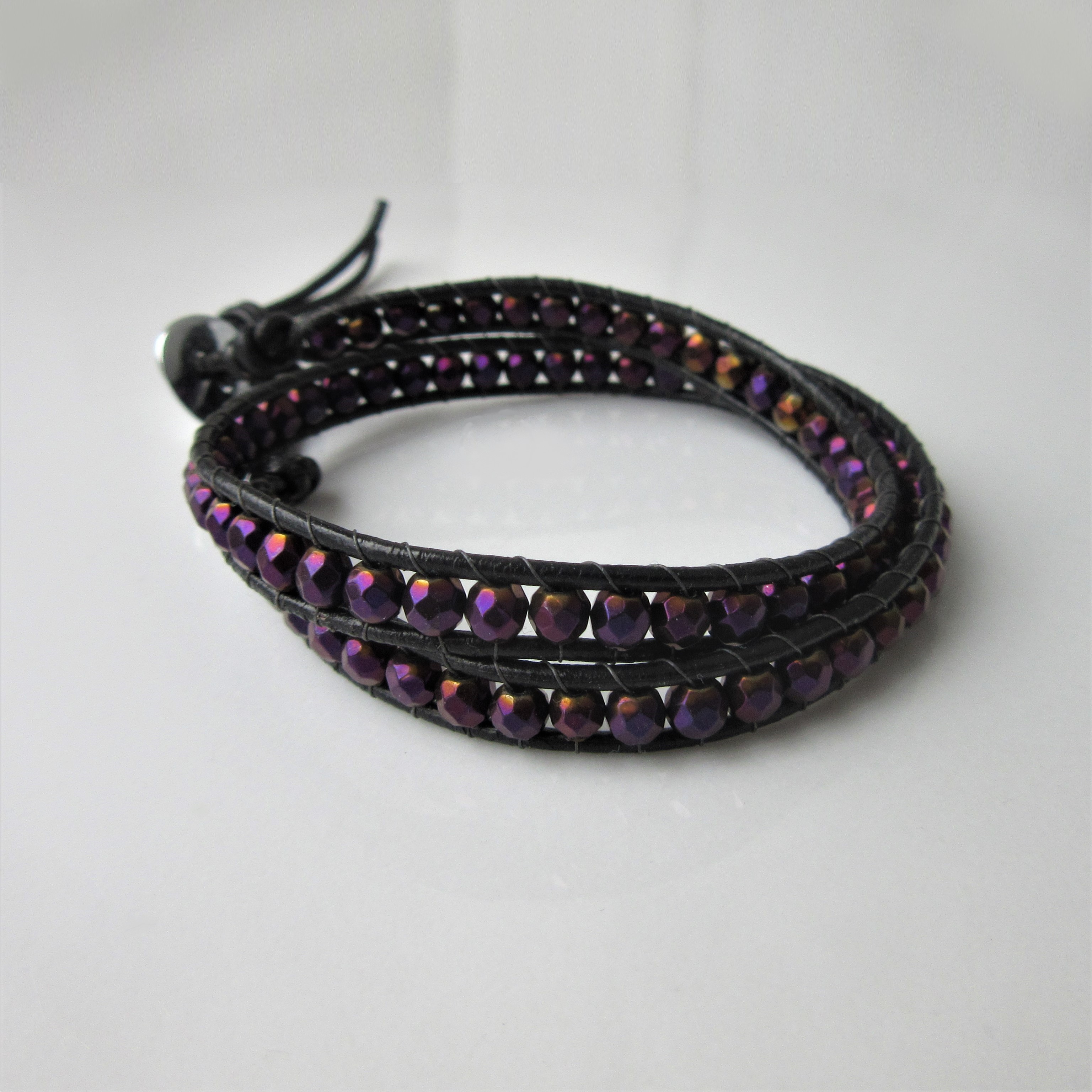 An explosion of colors, positivity and individuality, presented in the form of this amazing deep purple Aura double wrap bracelet. What makes our wraps completely unique are their materials and strength. We use genuine semi-precious stones called Hematite, enhanced with a brilliant color-changing Aura surface that catches even the smallest rays of light, lending mesmerizing sparkle to your every move. The stone is also well known for its powerful antidepressant and protective properties. The clasp can either be Sterling Silver or a metal alloy, giving you the choice of high-quality materials or fashion on a budget! Combined with genuine leather and an especially resistant type of cord connecting the pieces, this show-stopping accessory is not only gorgeous but also uniquely resistant. It can be worn every day or as a finishing touch for a night out, but once you get your hands on one you won’t have the heart to take it off.