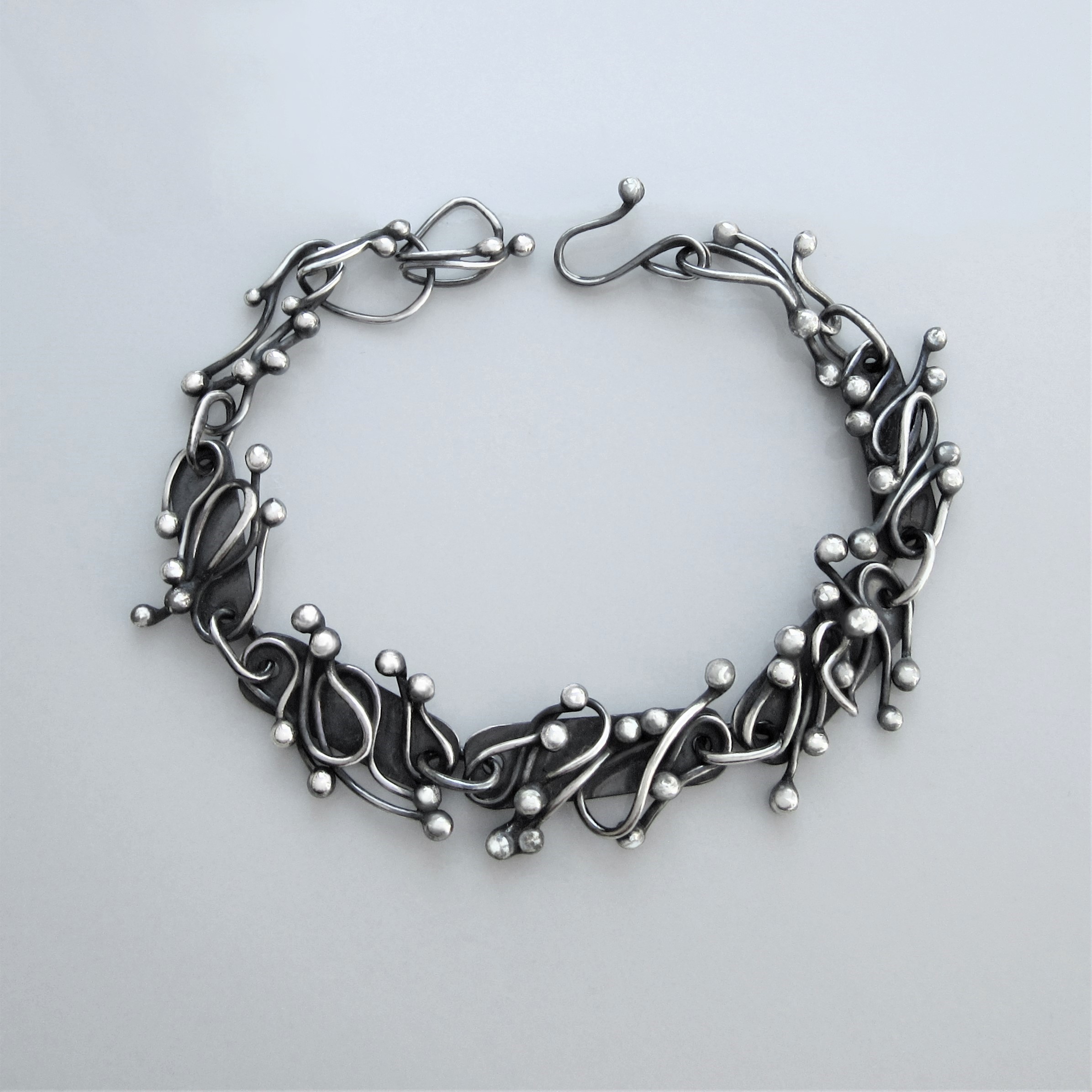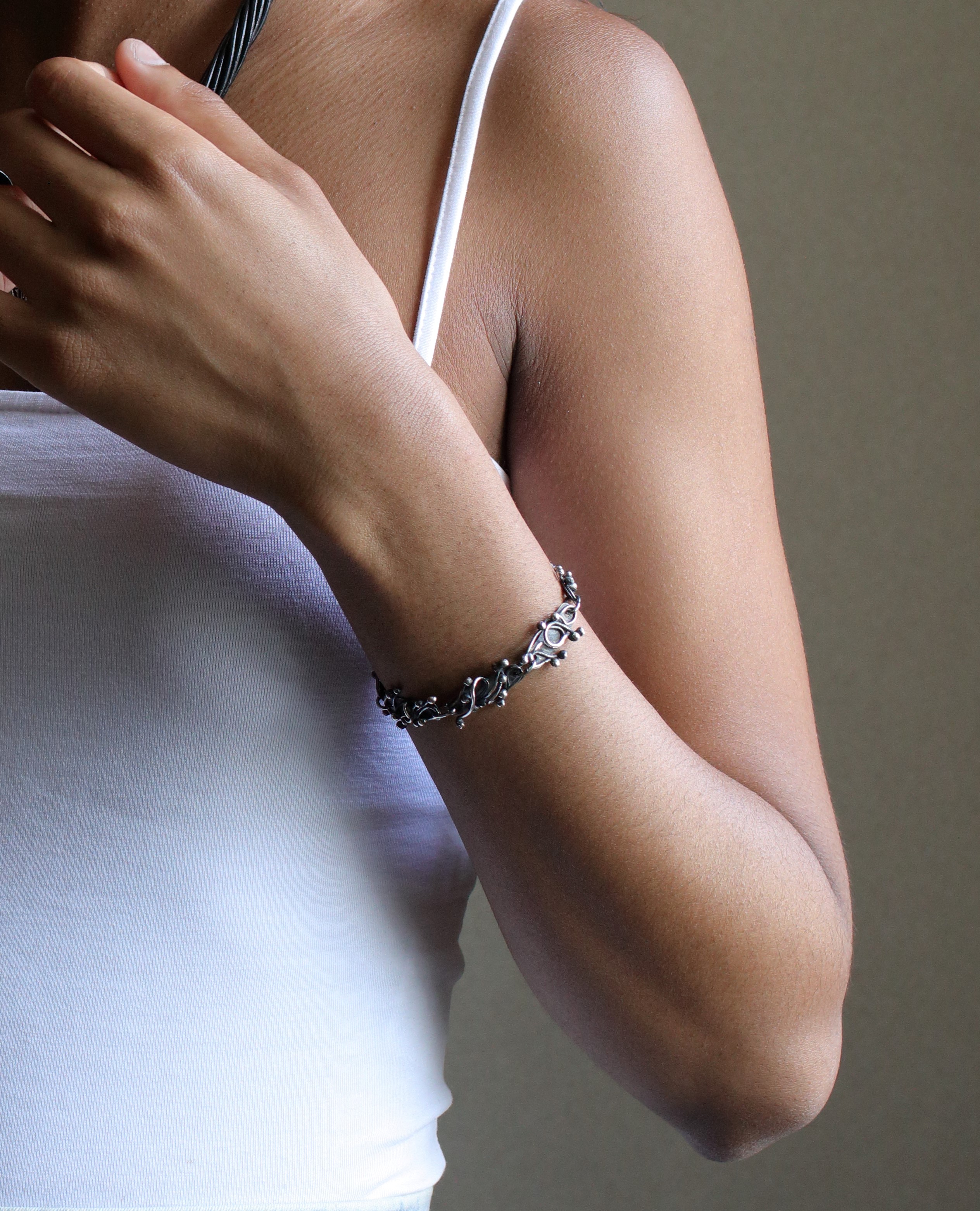 This delicate, one of a kind, hand-crafted pure Silver bracelet, breathes subtle elegance with its romantically intertwined elements. Each twirl bent by hand and each link connected into a silver stream, effortlessly achieving visual fluidity. Perfect for finishing any attire, an everlasting piece such as this will quickly tangle its way around your heart.