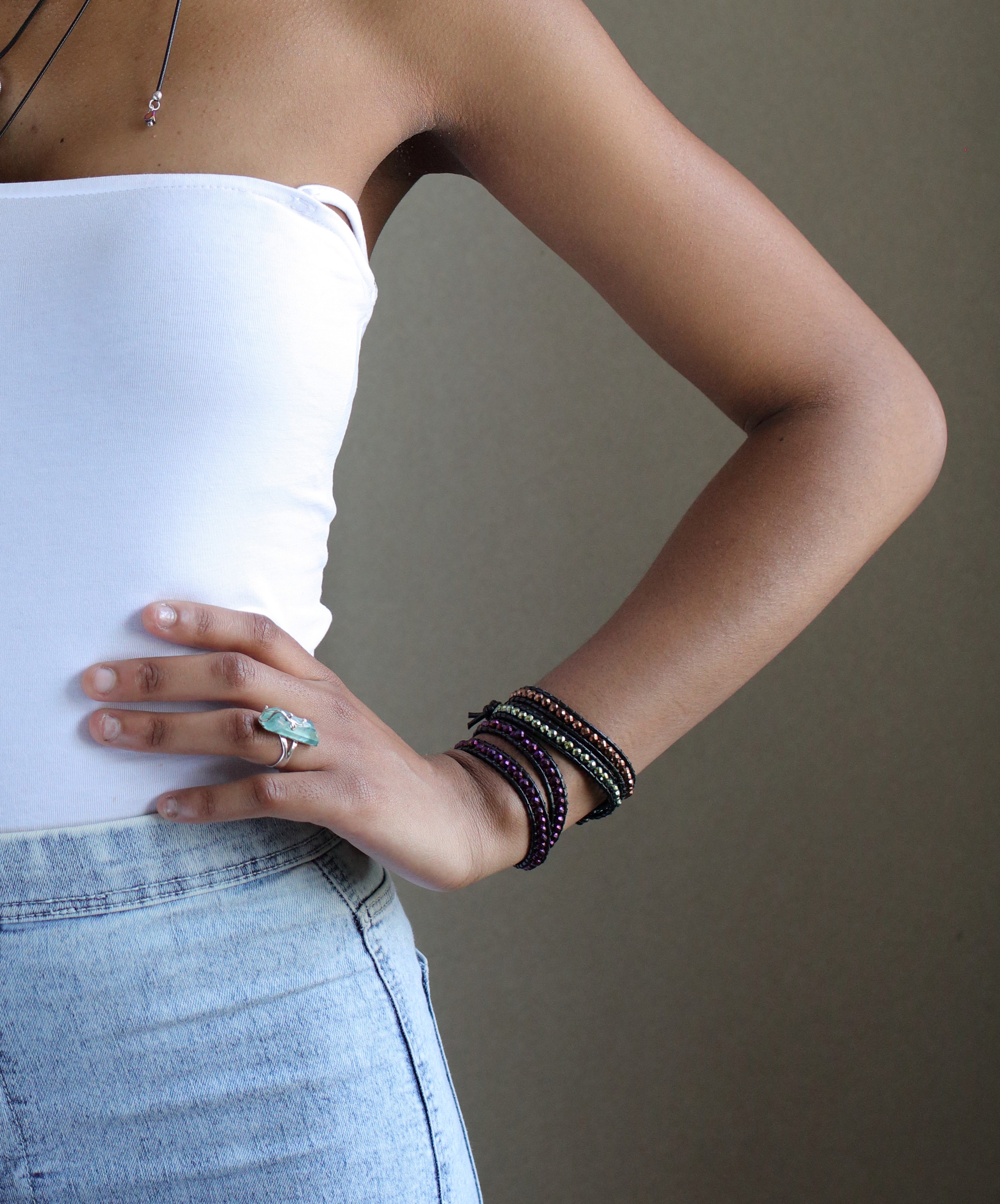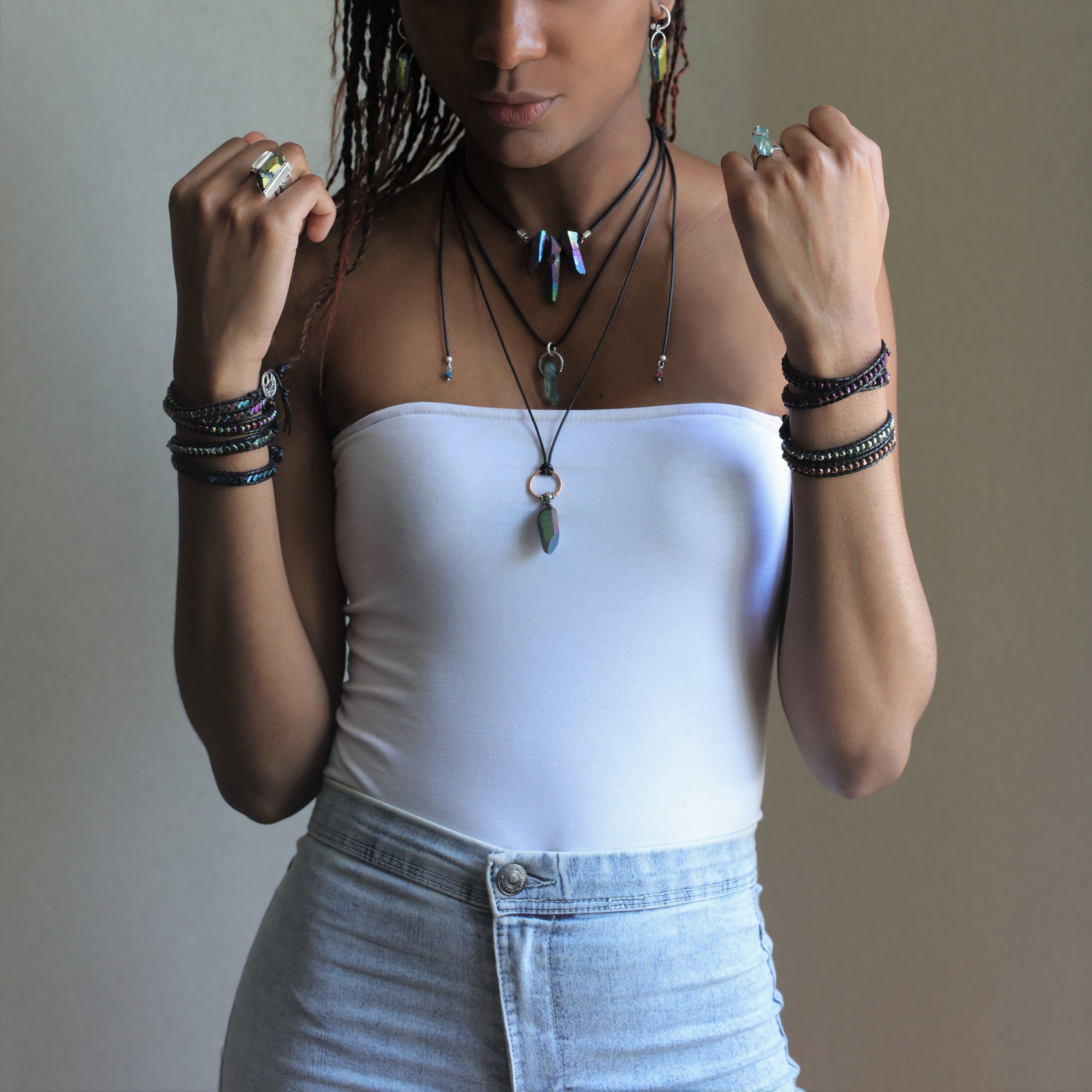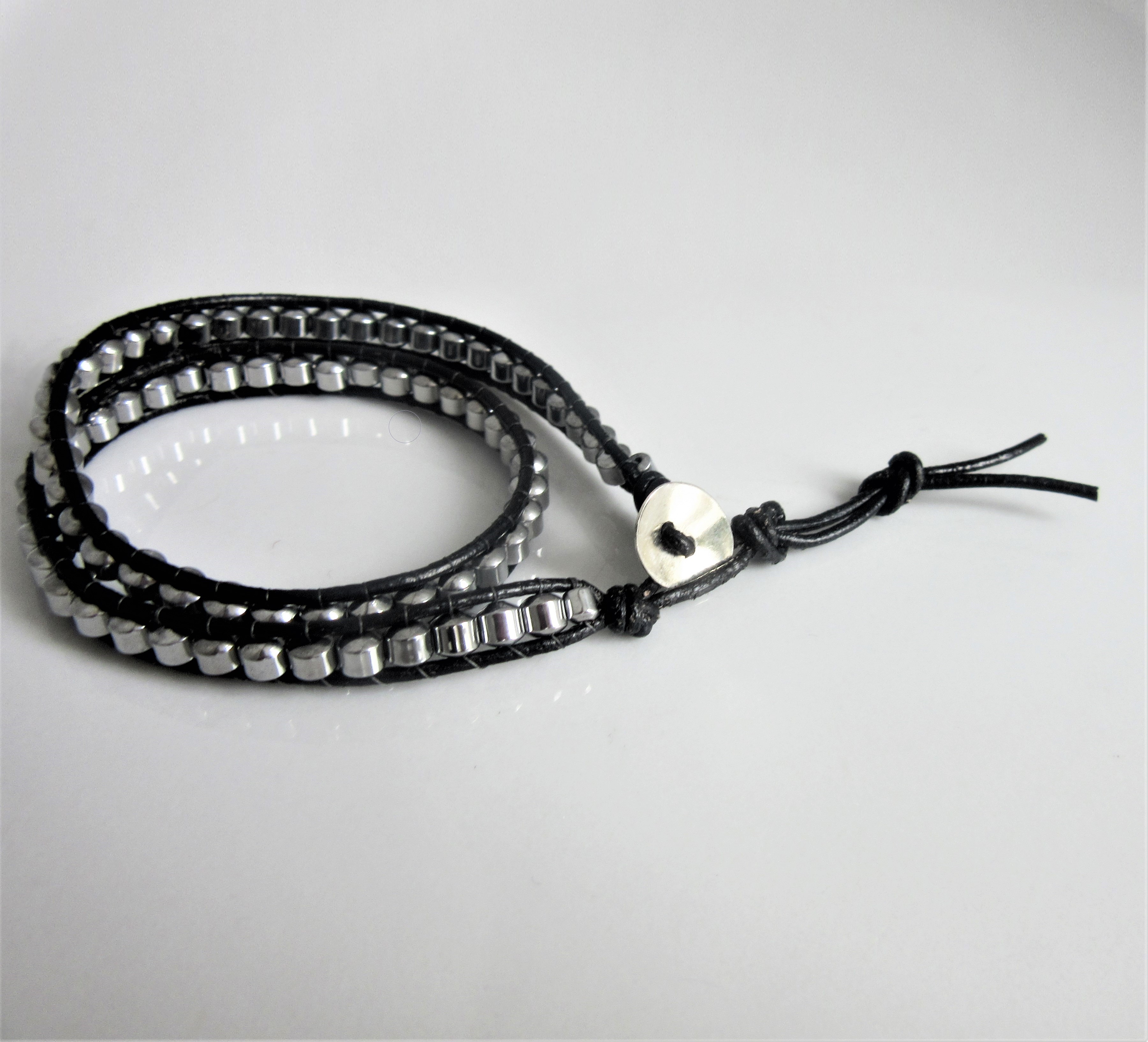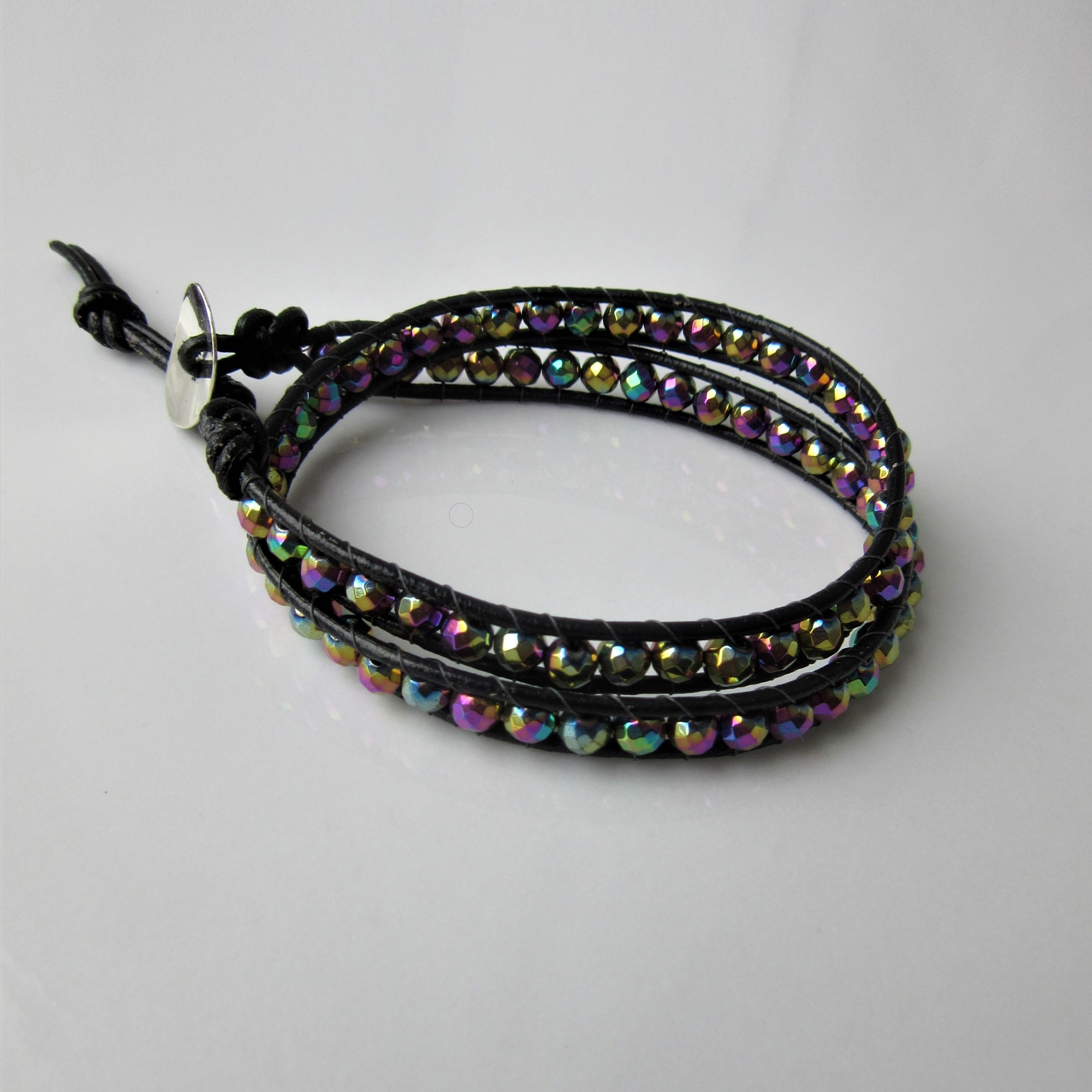 An explosion of colors, positivity and individuality, presented in the form of this amazing Rainbow Aura double wrap bracelet. What makes our wraps completely unique are their materials and strength. We use genuine semi-precious stones called Hematite, enhanced with a brilliant color-changing Aura surface that catches even the smallest rays of light, lending mesmerizing sparkle to your every move. The stone is also well known for its powerful antidepressant and protective properties. The clasp can either be Sterling Silver or a metal alloy, giving you the choice of high-quality materials or fashion on a budget! Combined with genuine leather and an especially resistant type of cord connecting the pieces, this show-stopping accessory is not only gorgeous but also uniquely resistant. It can be worn every day or as a finishing touch for a night out, but once you get your hands on one you won’t have the heart to take it off.