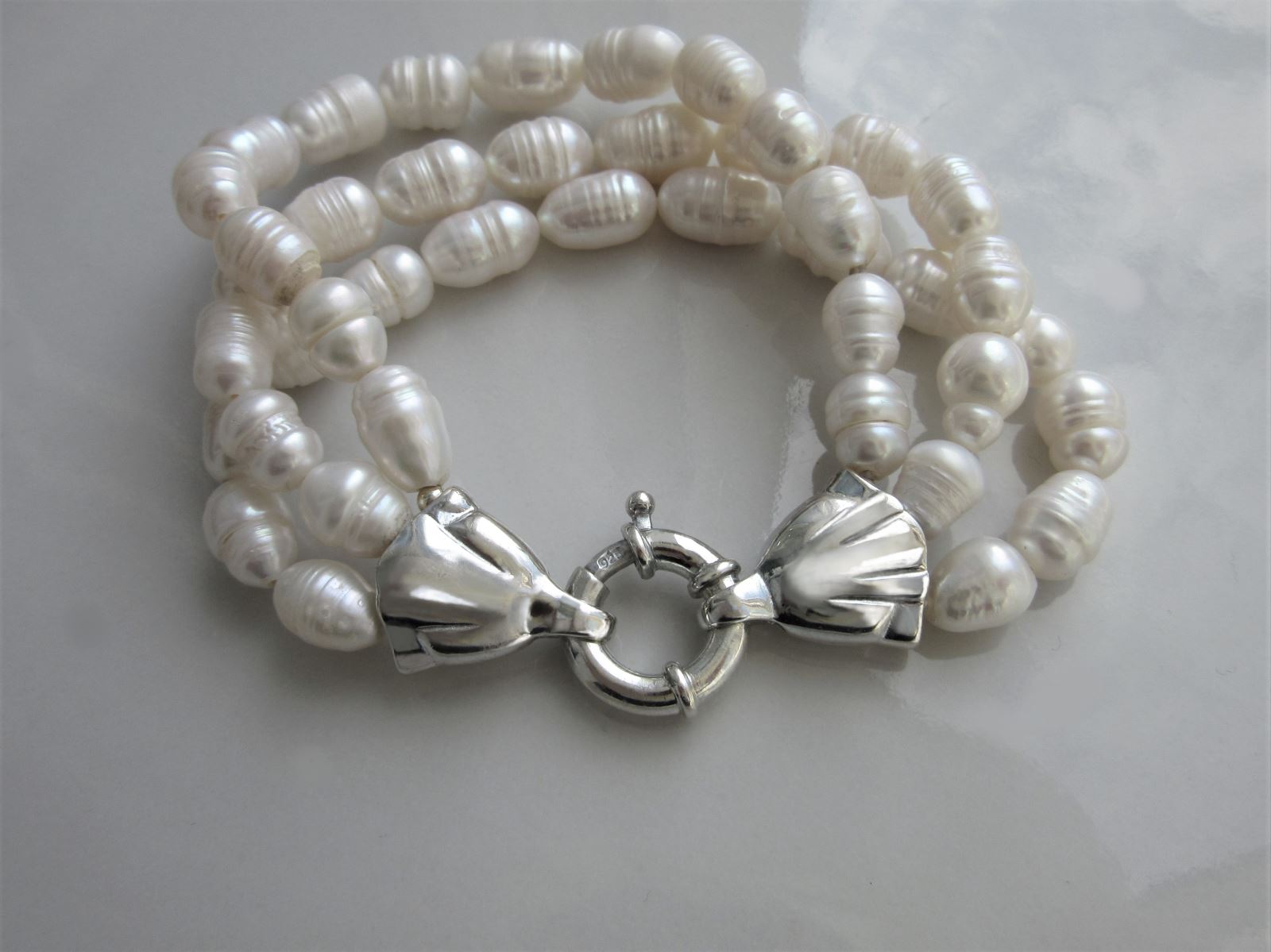 Three strands of glamorous white Pearls, held together by subtly decorated Sterling Silver connectors and a large, luxurious Italian clasp, make this piece the epitome of elegance. A timeless classic designed to accompany you to dates, dinners and operas for many years to come.