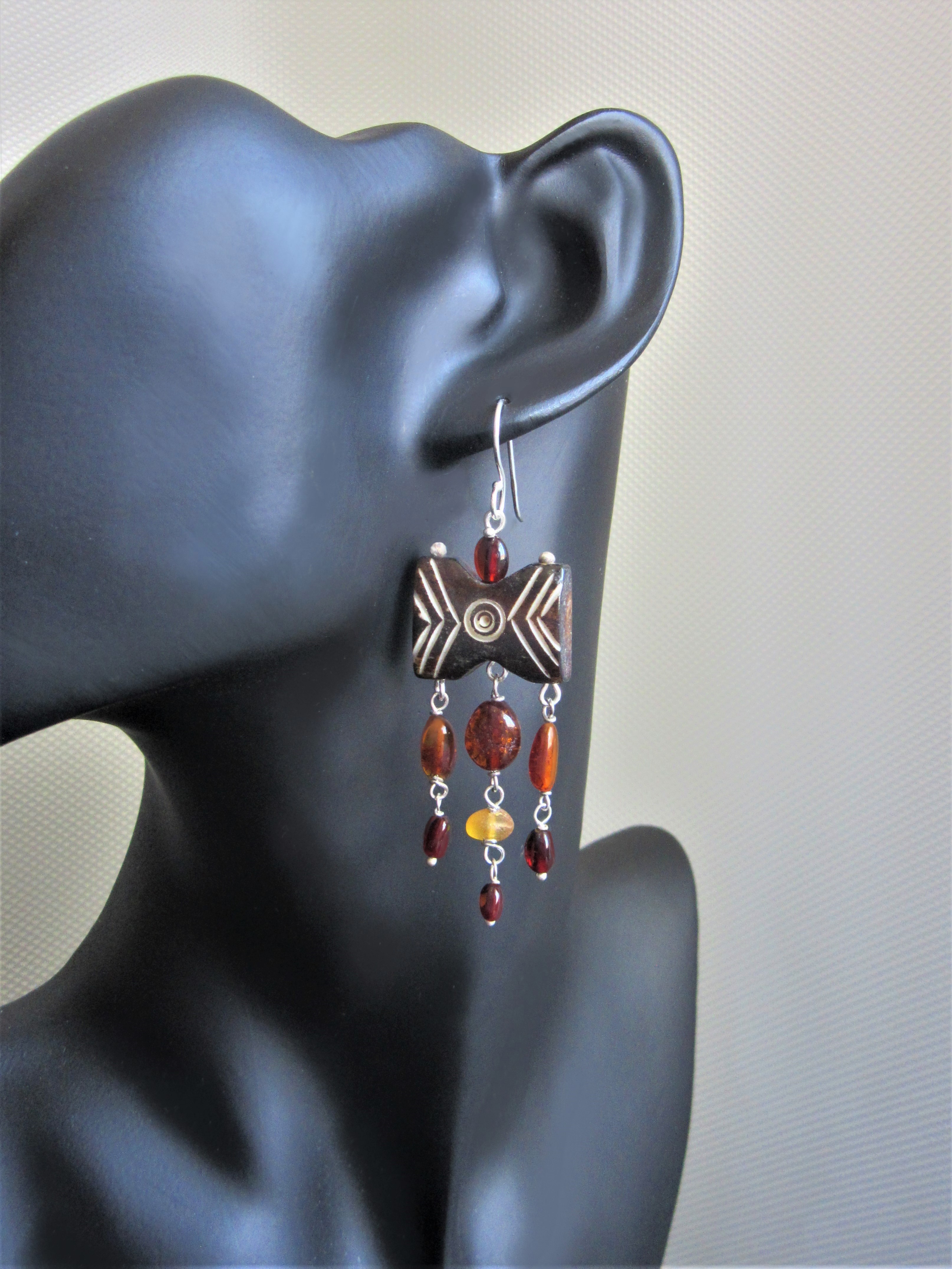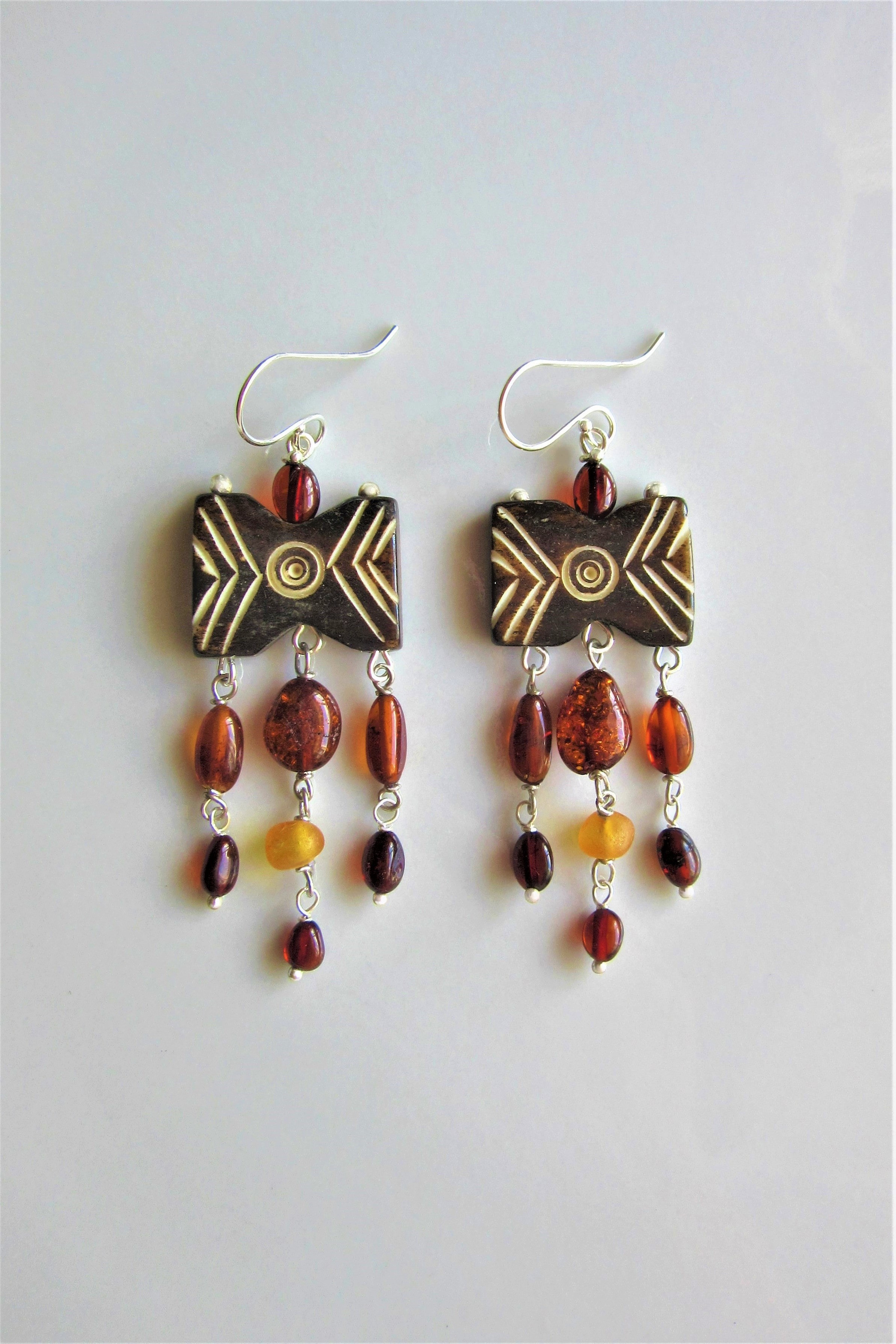 As part of the Touch Wood collection, these earrings bring a touch of ethnic fun to your jewelry repertoire. Lovely beads of Amber in varied shades of yellow, orange and dark brown, sway playfully from roughly carved Walnut wood. According to ancient legends, these materials combined bring forth good luck and prosperity, while simultaneously serving as a unique accessory perfect for both a casual and classy ensemble.