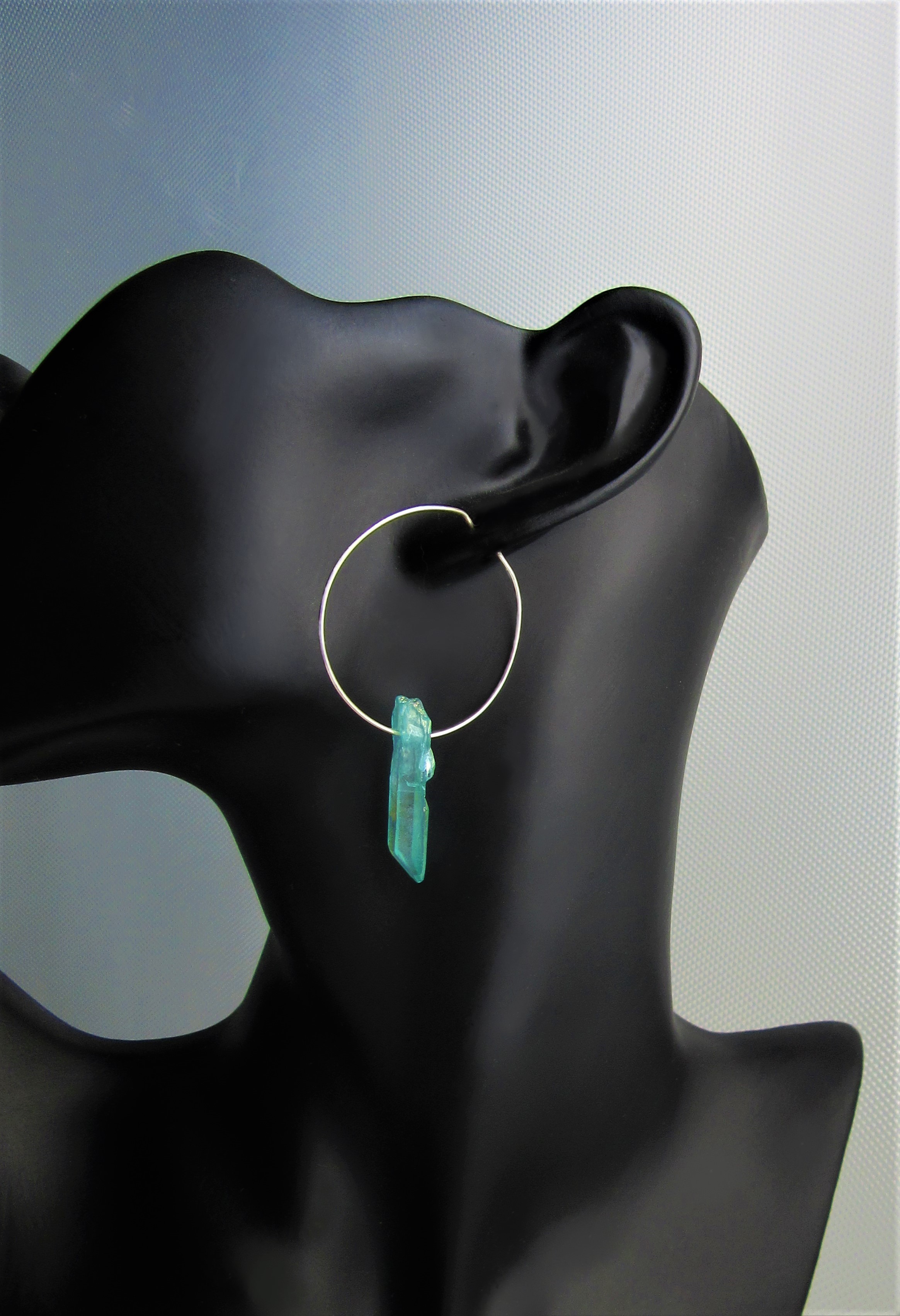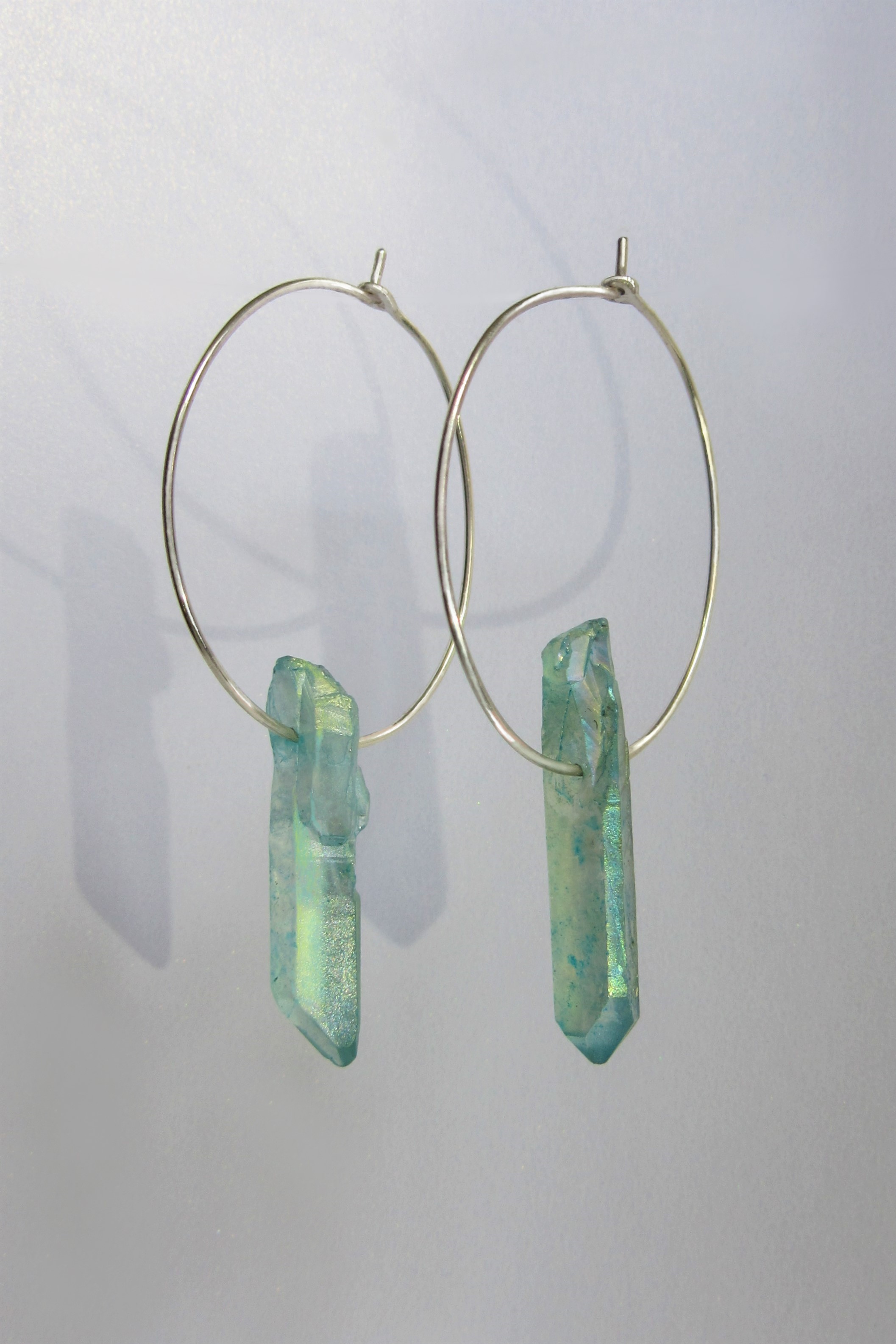 As an opposition to the boring simplicity of plain hoops, this pair of captivating Aura earrings adds a touch of magic to the already seen and overdone look. Strikingly beautiful Aqua Aura Quartz, shines wondrously with an enchanting blue hue, enhanced with mesmerizing flashes of rainbow opalescence. Known as the stone of the mind, the Aqua Aura brings forth mental clarity, increases psychic awareness and amplifies psychic abilities.