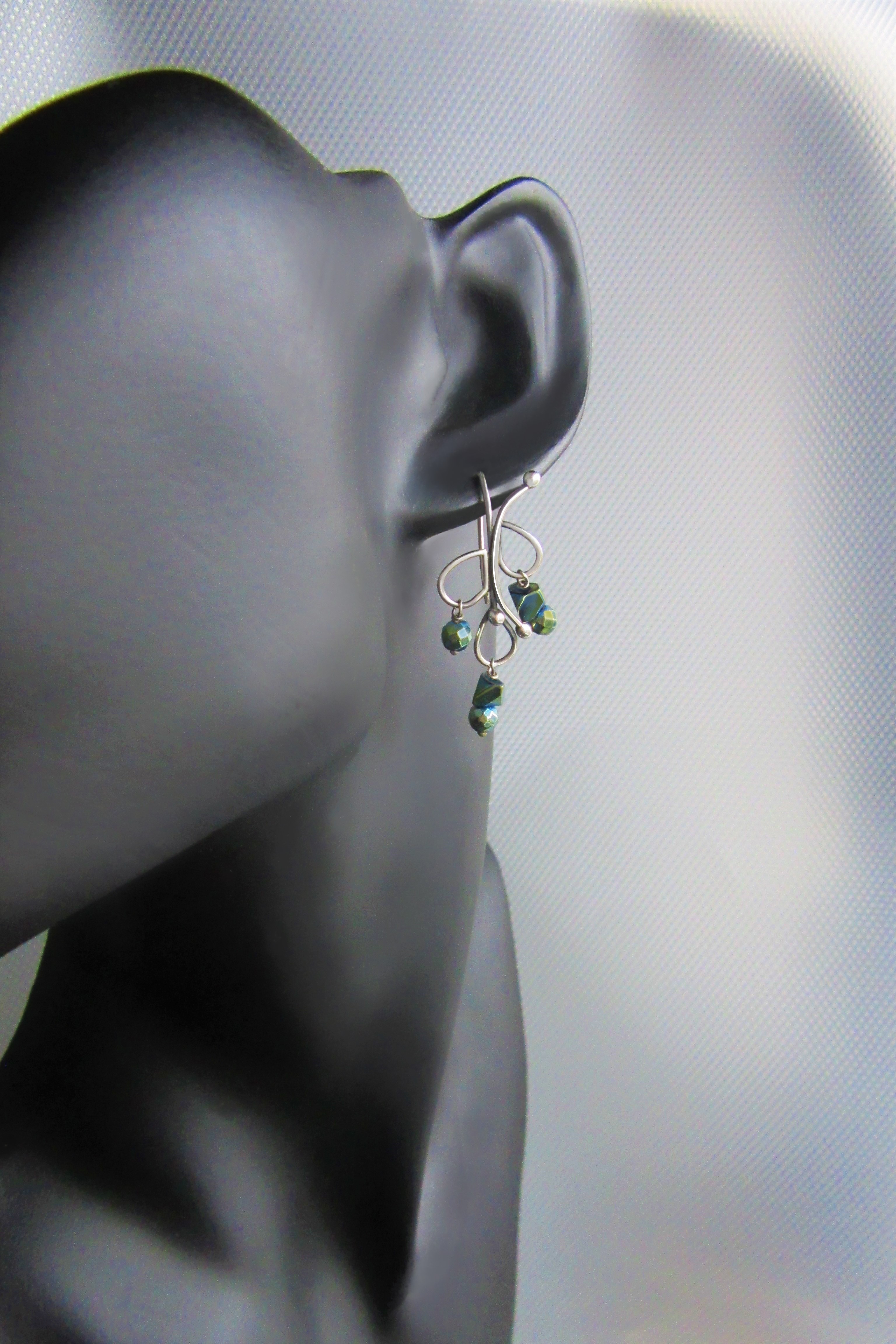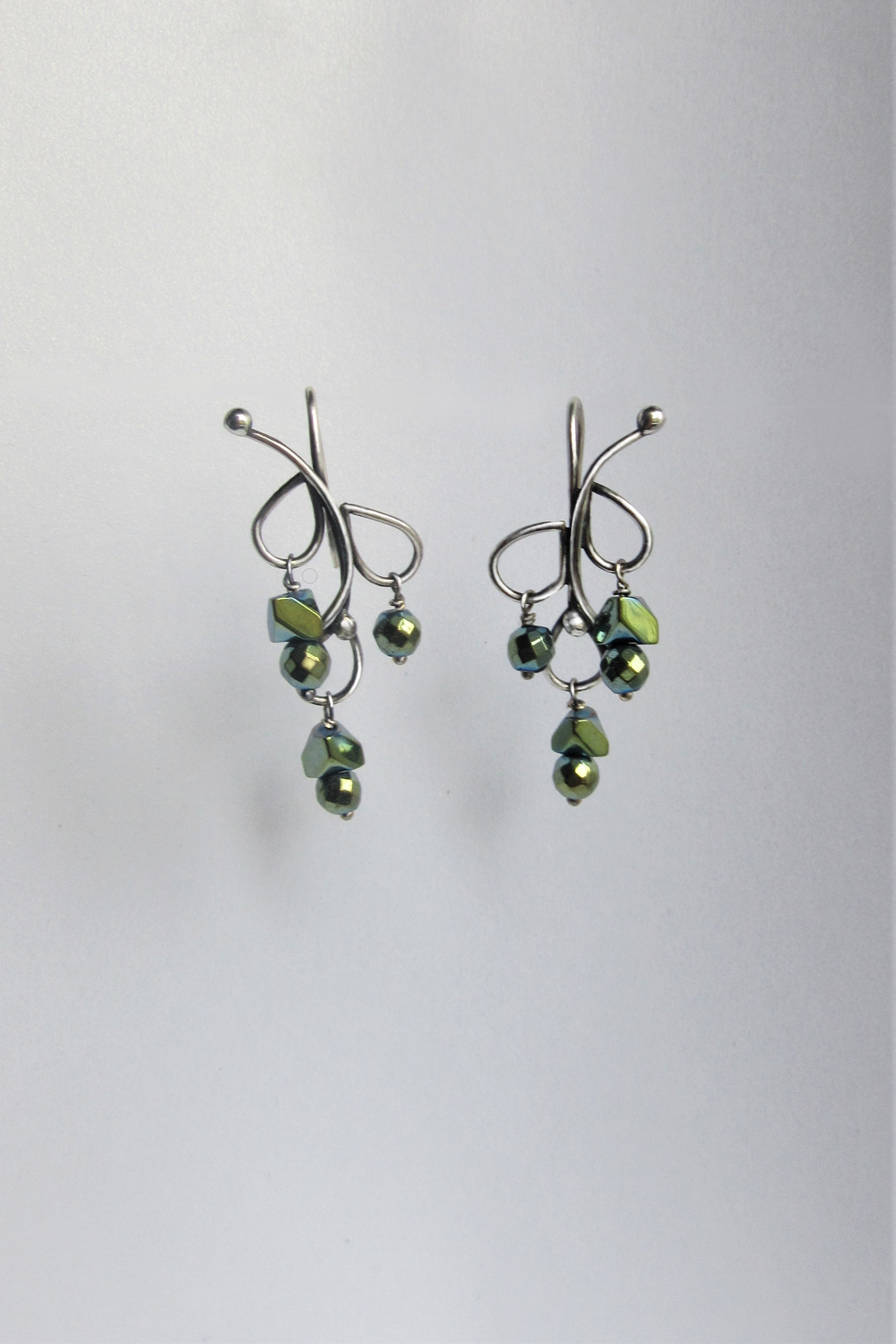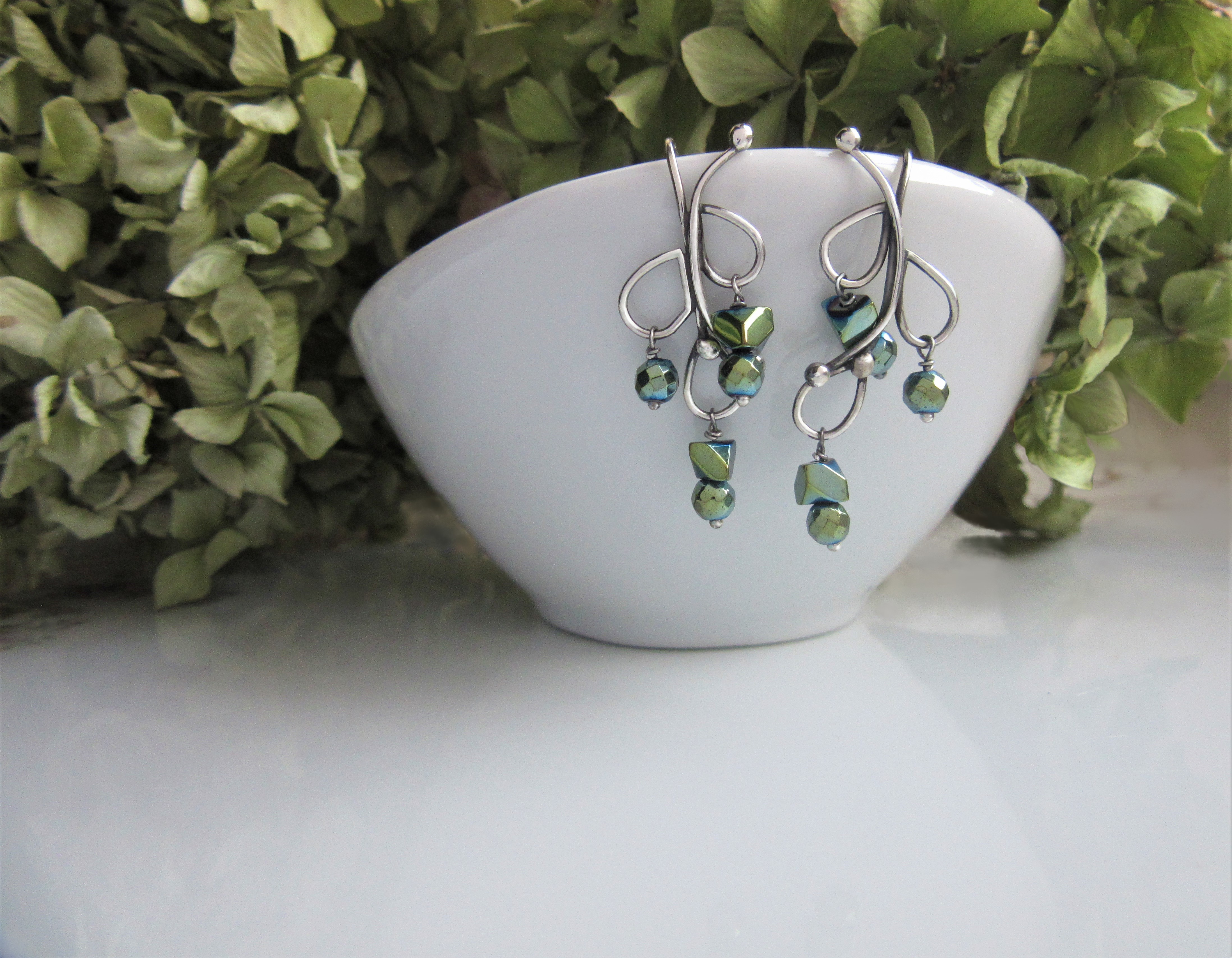 The delicate wonder of blooming branches, achieved with romantic Sterling Silver teardrops from which shimmering Gold Cobalt Aura Hematite beads dangle playfully. The ambiguous hue of the Hematite Aura, swaying between gold, blue and green, wonderfully complements all outfit choices. Celebrate the beauty of nature and creation with this adorable, yet elegant pair of dangle earrings.