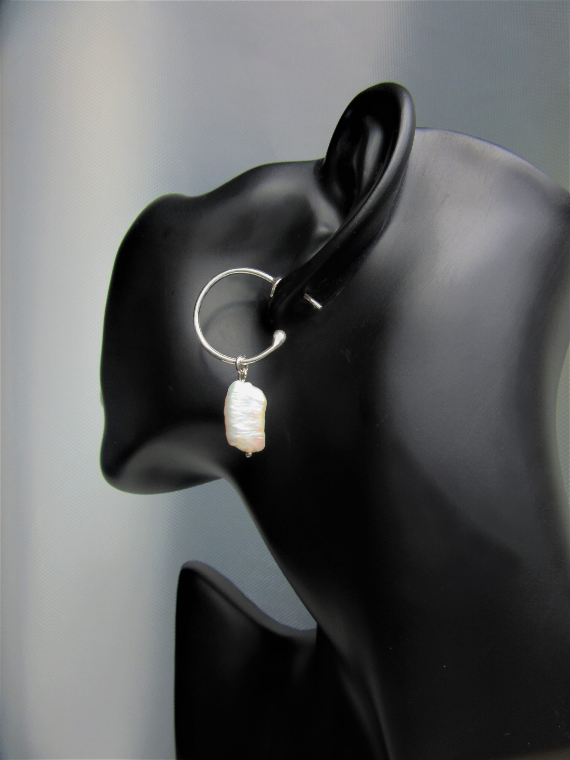 With an interesting twist to the classic hoop design, this fabulous pair features a semi-hoop, ending with a large Silver bead rather than creating a full circle. From it are suspended two mesmerizingly lustrous pieces of Baroque Pearl, perfect in their natural asymmetry. Celebrating all that is raw and unique, this beautiful pair is a magical addition to your jewelry repertoire.