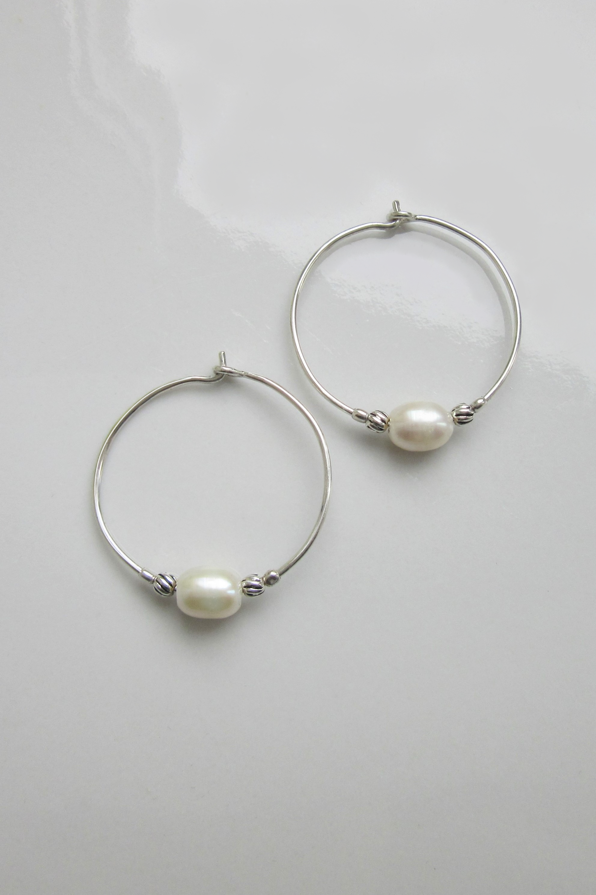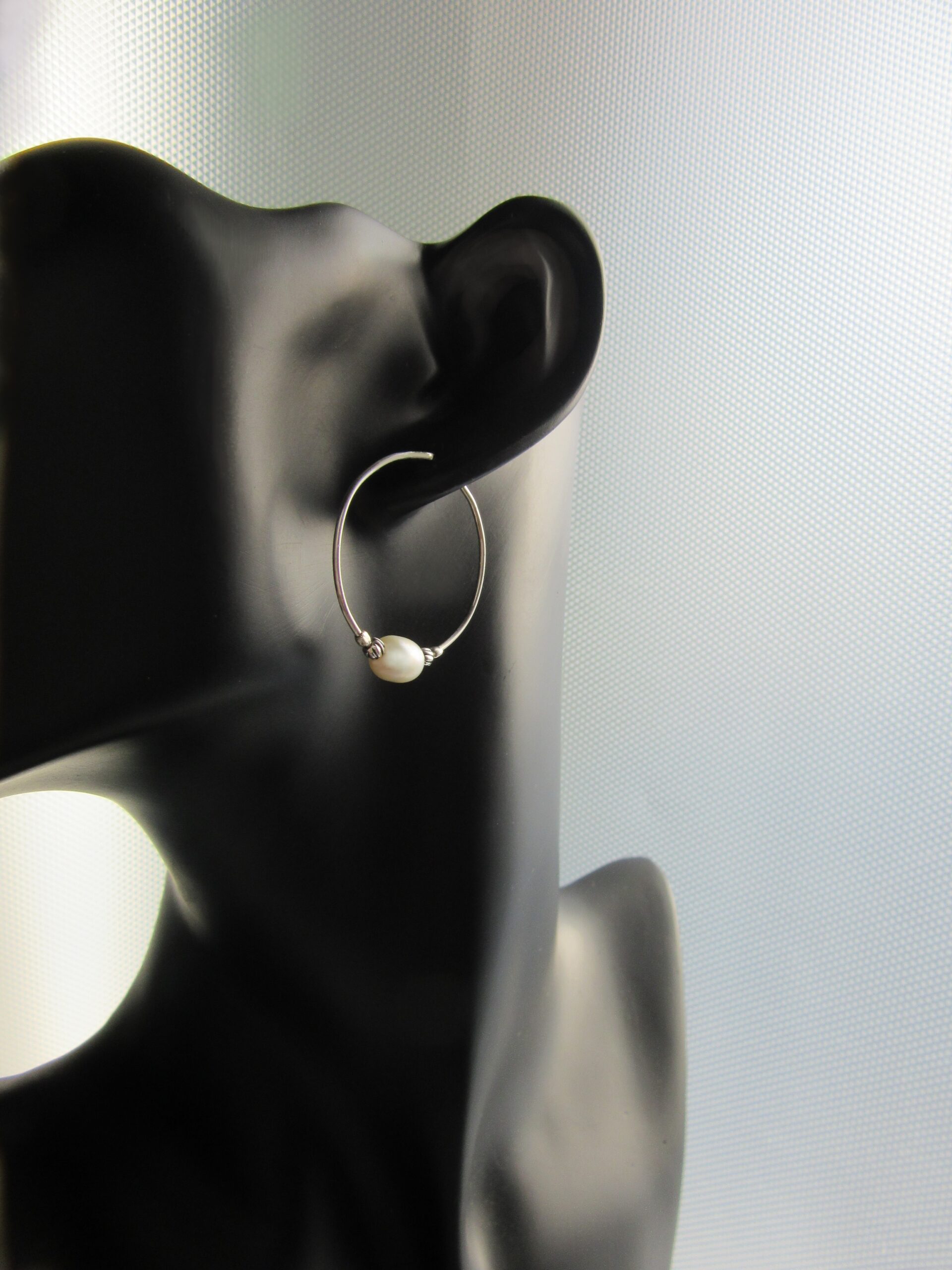A simple hoop design is transformed into an everlasting accessory that exudes elegance with the simple addition of a delicately glistening freshwater Pearl. The piece is further enhanced with subtly ornamented Sterling Silver Balinese beads, gracing the sides of each lustrous Pearl. Light and effortless to wear, this beautiful pair is a perfect finishing touch to any ensemble.