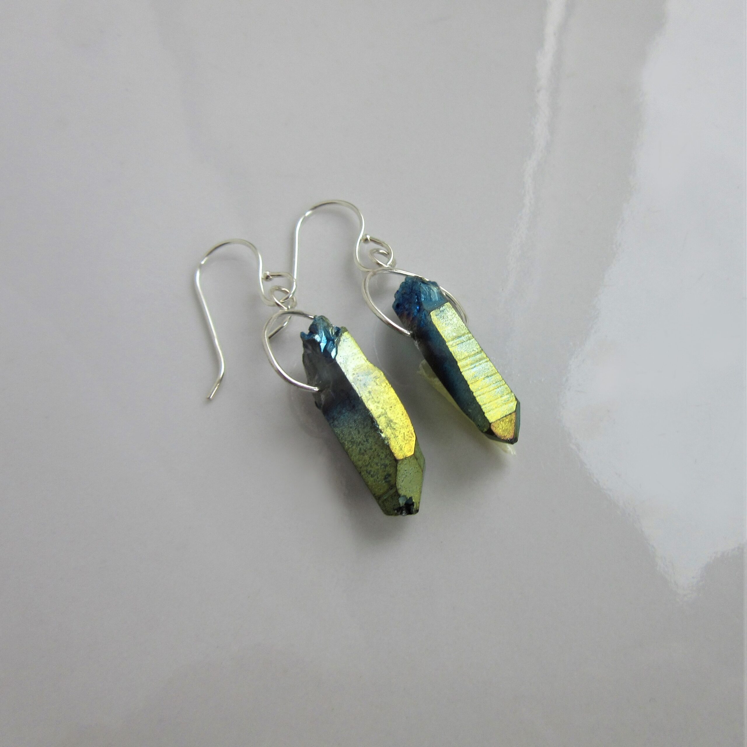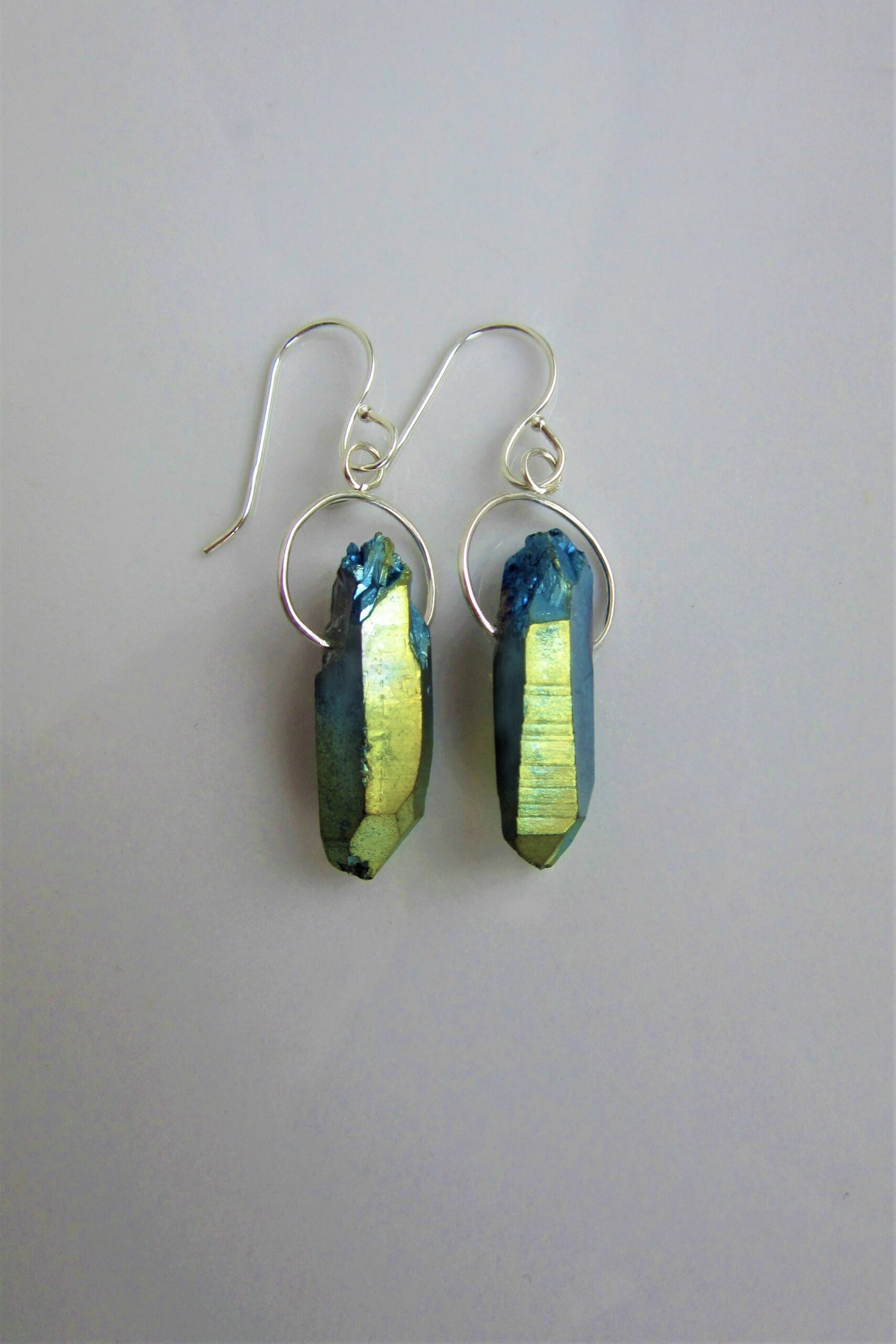 This beautiful pair of unique earrings features two dazzling pieces of Gold Cobalt Aura Quartz, purposefully chosen for their asymmetrically wondrous, raw appearance, both graced with their own Sterling Silver halo. Each facet shines blindingly with entrancing hues of gold and blue melting into each other. Exuding glamour for both day and night, this astonishing statement pair is crafted to amaze and ready to stun.