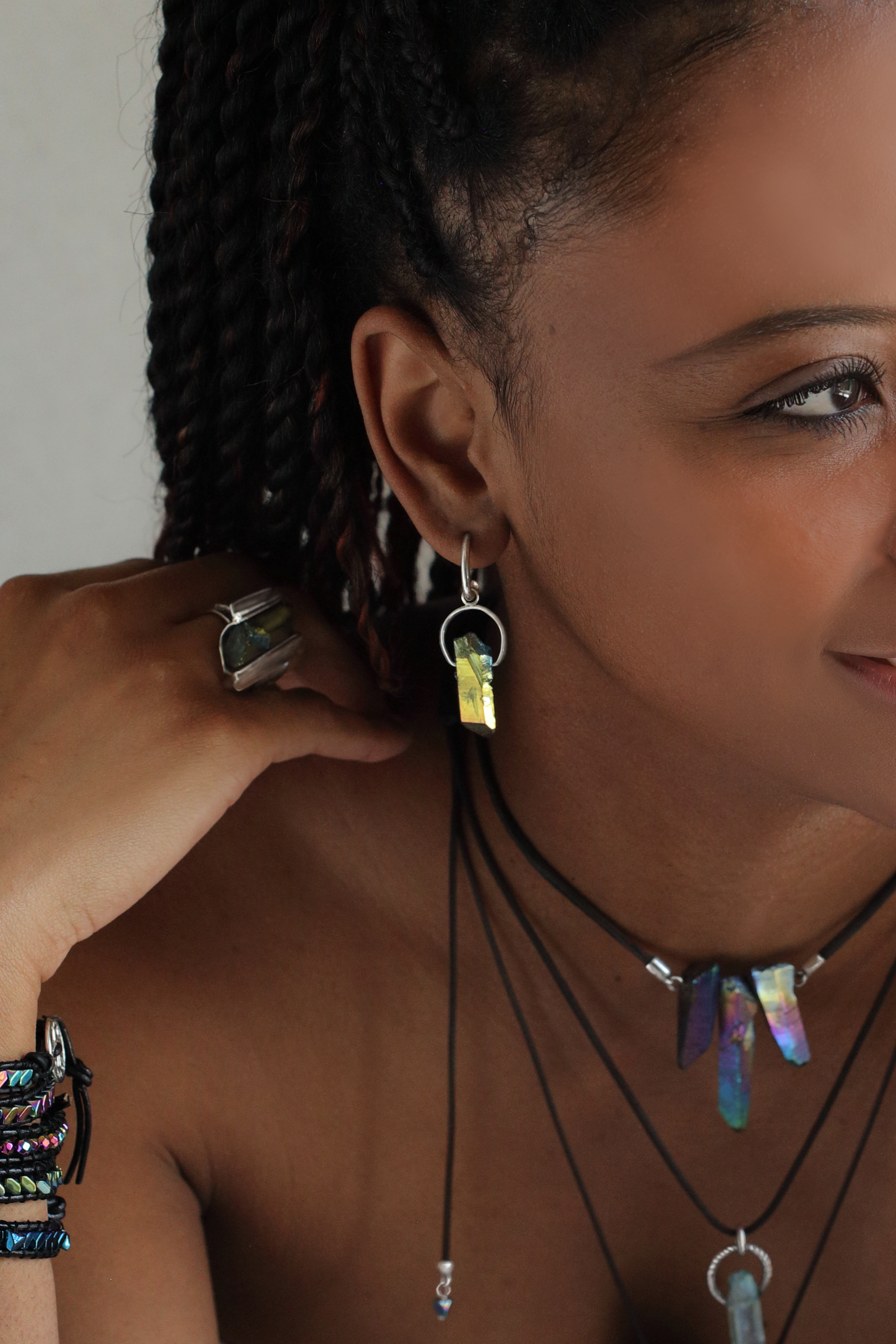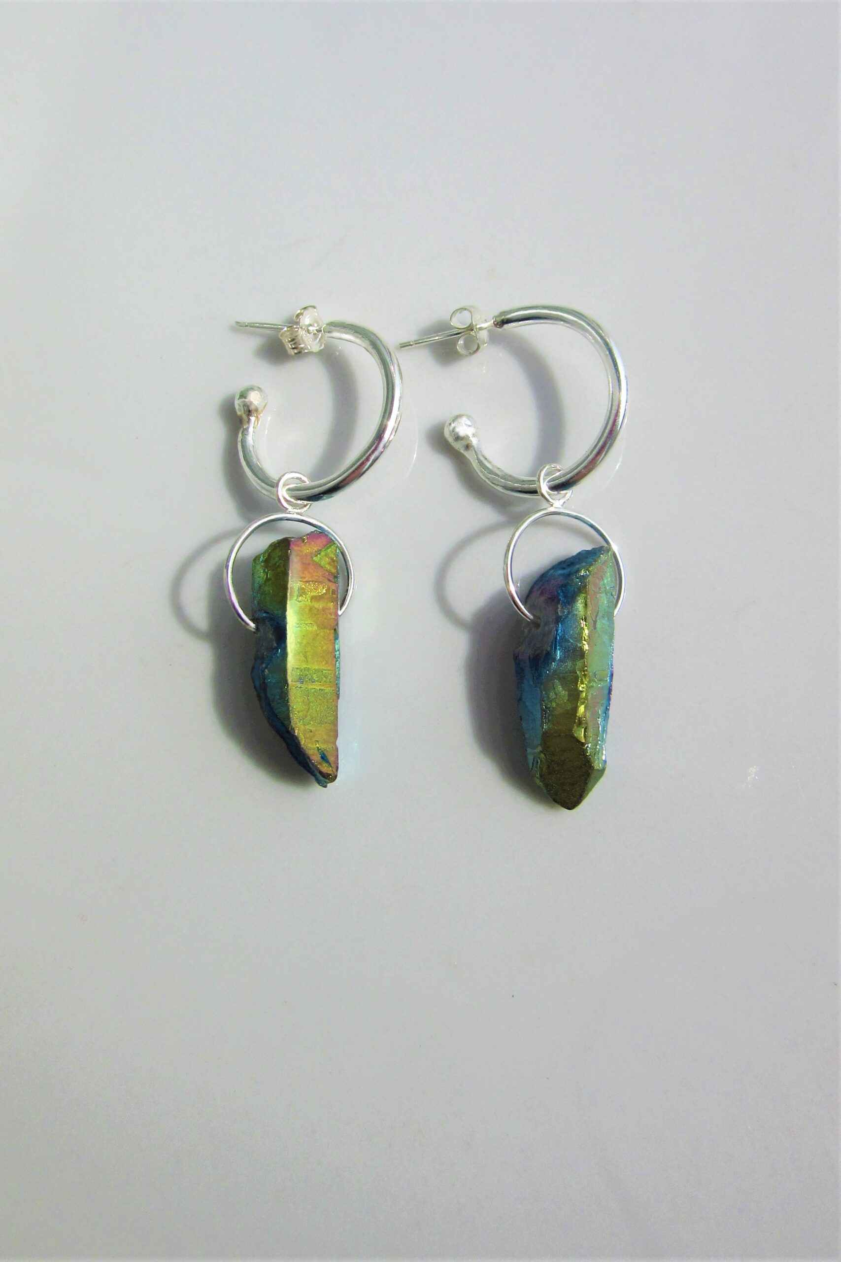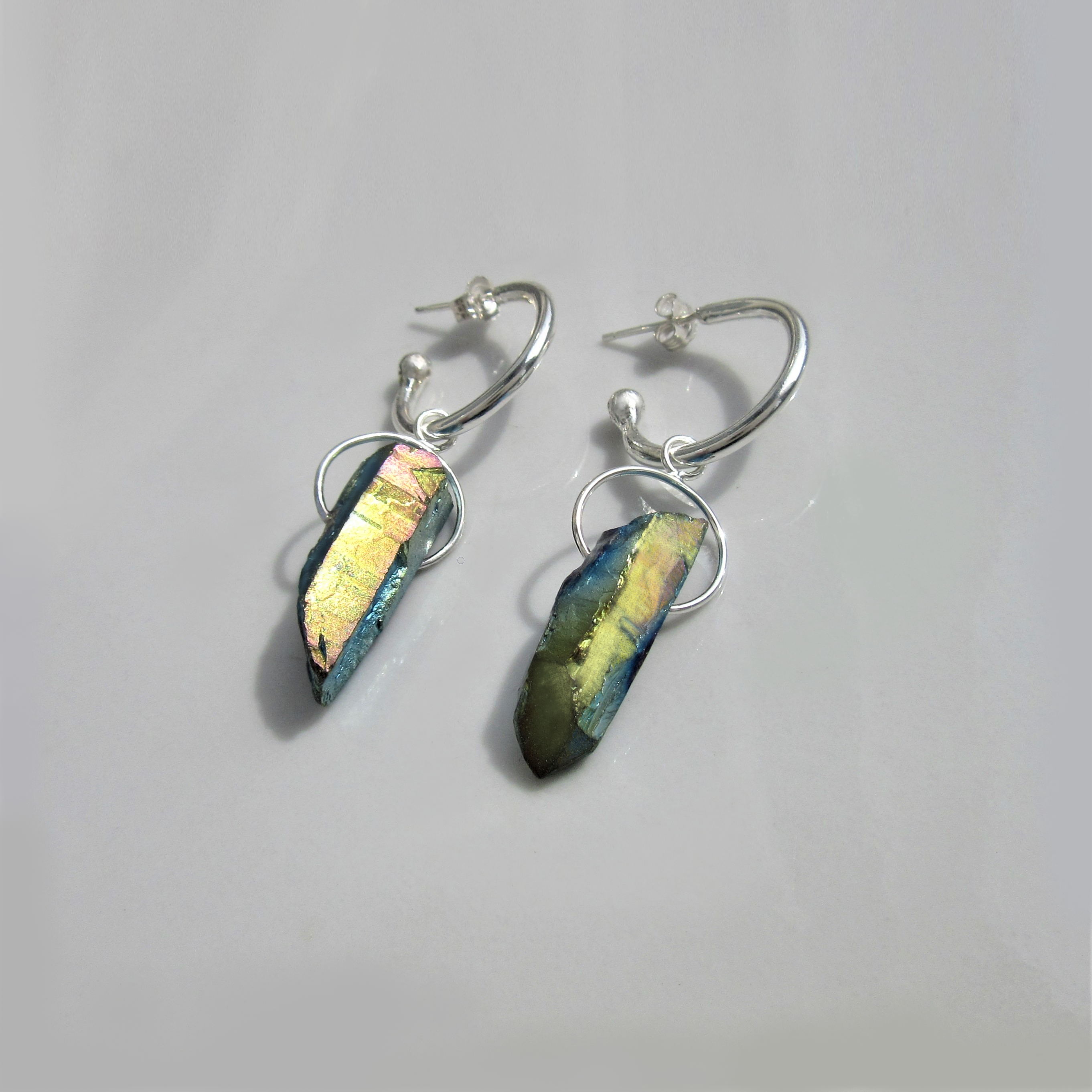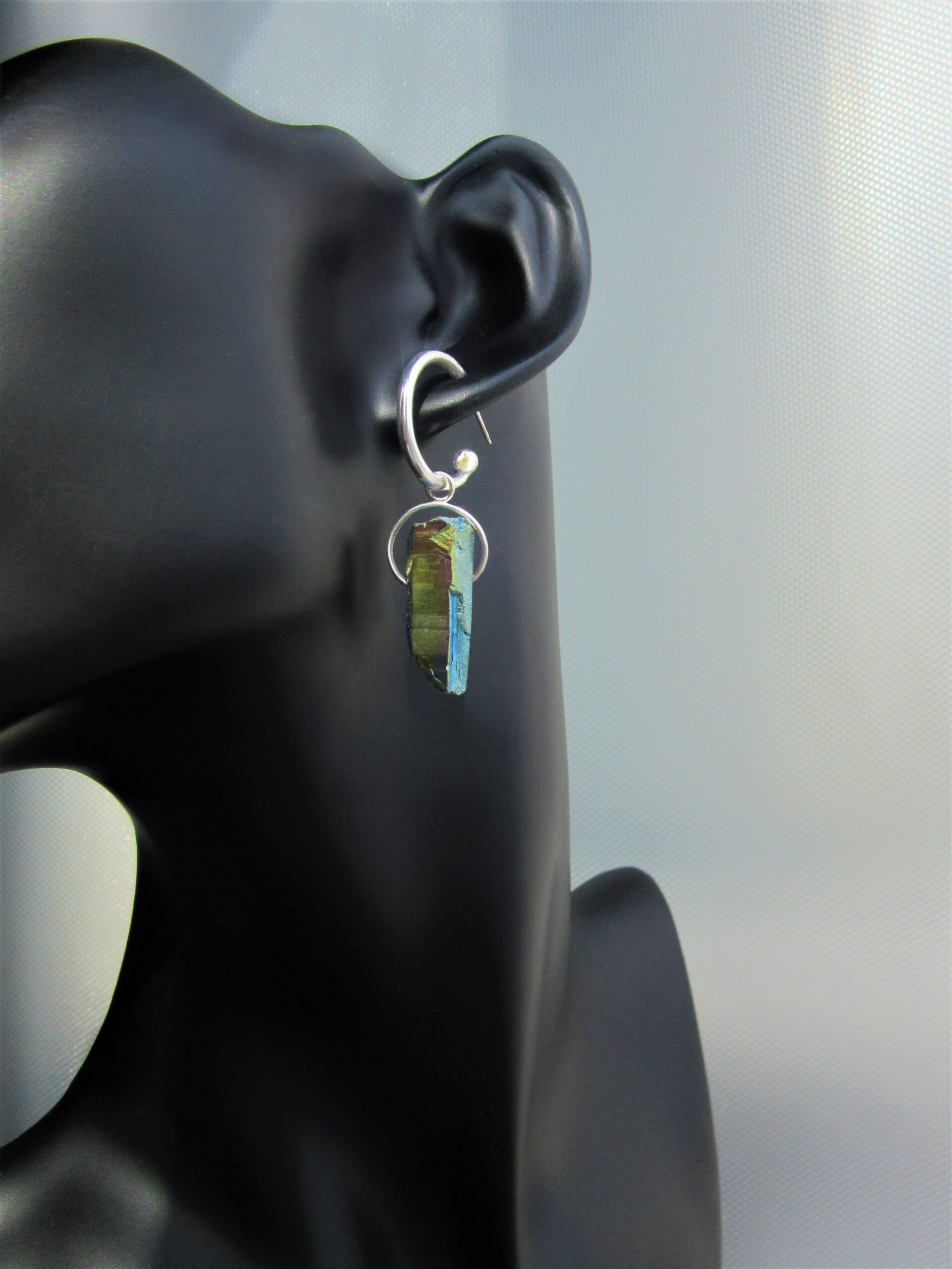 With an interesting twist to the classic hoop design, this fabulous pair features a semi-hoop, ending with a large Silver bead rather than creating a full circle. From it are suspended two dazzling pieces of Gold Cobalt Aura Quartz, purposefully chosen for their asymmetrically wondrous, raw appearance, both graced with their own Sterling Silver halo. Each facet shines blindingly with entrancing hues of gold and blue melting into each other. Exuding glamour for both day and night, this astonishing statement pair is crafted to amaze and ready to stun.