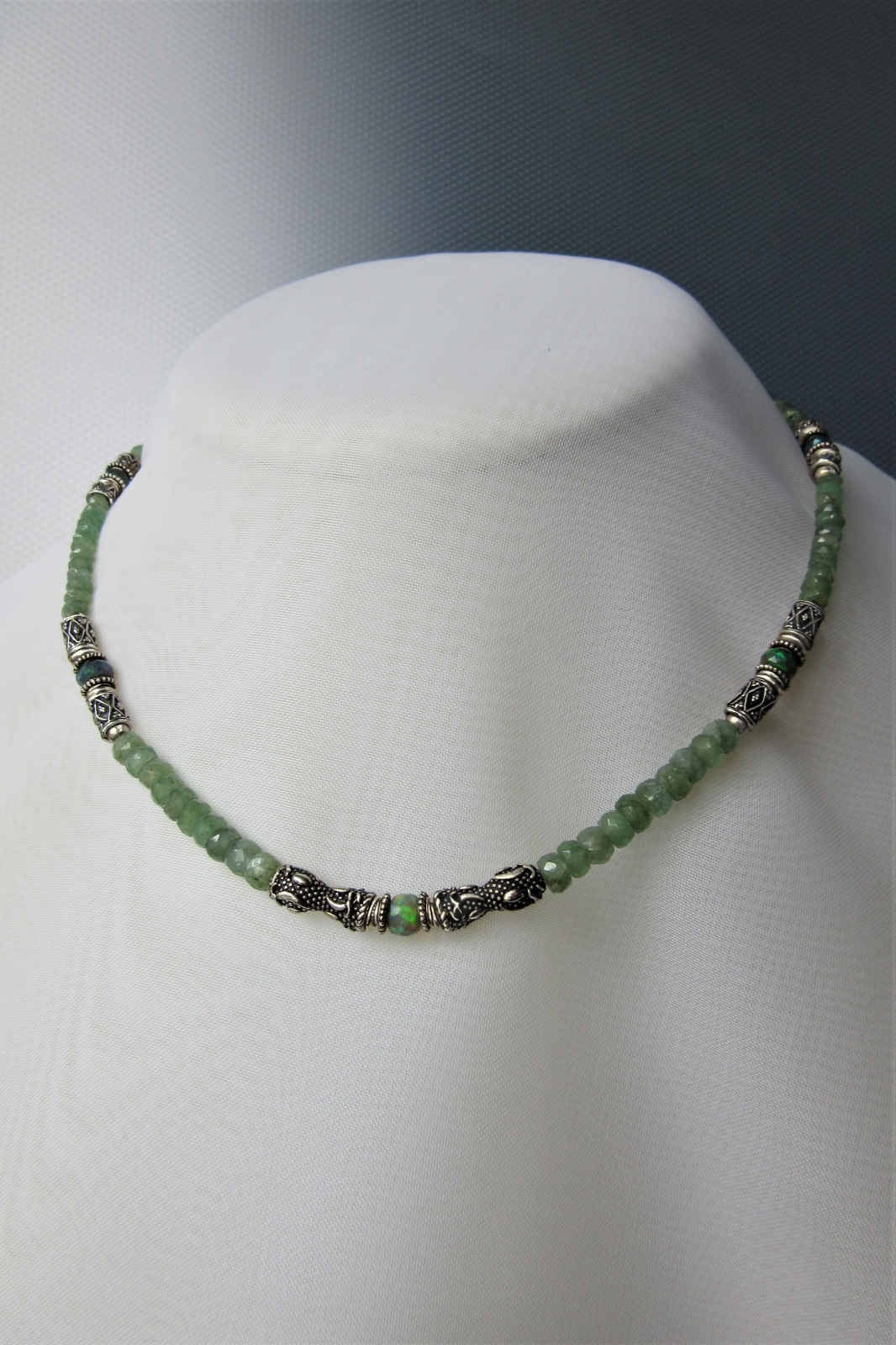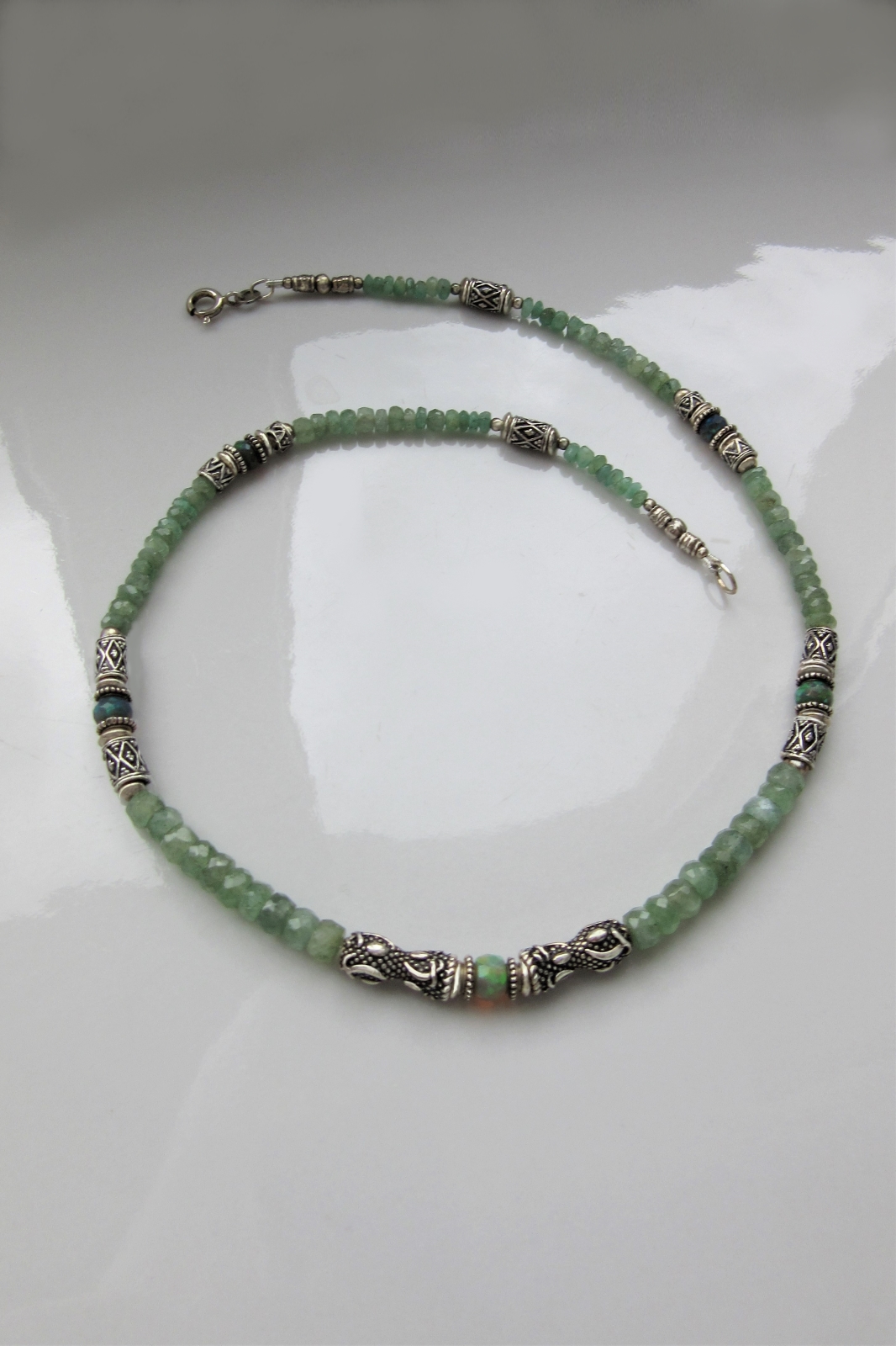 Throughout history Emerald was known as a gemstone of royalty, only kings and queens being able to adorn themselves with it. This necklace features a mesmerizing string of delicately shimmering, soft green Emeralds and breathtaking Harlequin Opal with majestic hues of green and blue which glimmer dramatically from within at the slightest hint of light. Intricately granulated and antique finished Sterling Silver Balinese beads highlight the beauty of these gems and add to the luxury of the piece. Opal’s positive energy bestows joy and optimism to the wearer, while Emerald’s soothing energy provides healing to all levels of the being, bringing freshness and vitality to the spirit. Regardless of the spiritual properties of this necklace, it exemplifies pure, stunning elegance you’ll want to adorn yourself with for every occasion.