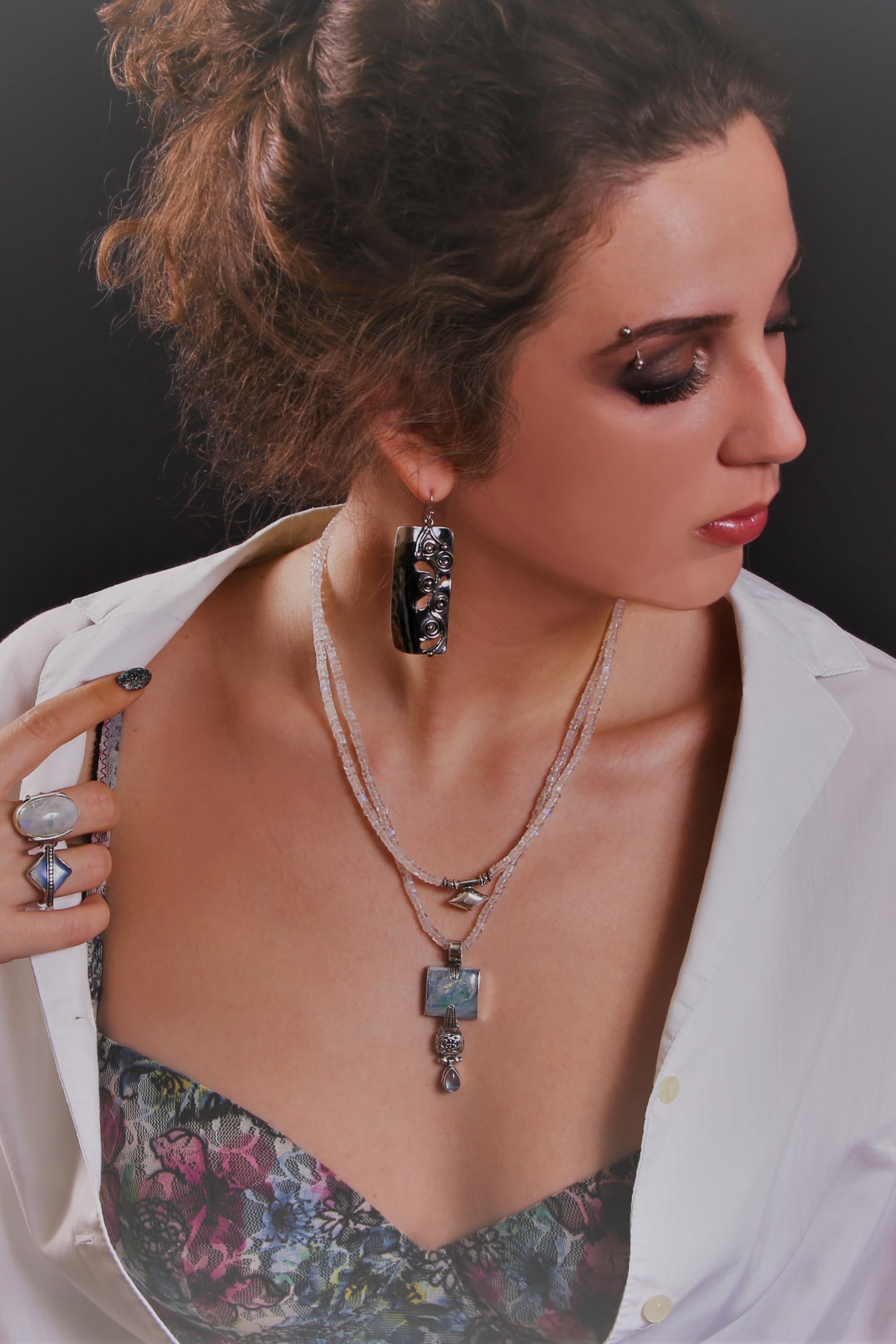 This mesmerizing bespoke pendant necklace features breathtaking Moonstone pieces adorned with intricately ornamented Balinese Silver elements. Soft iridescent shimmer of blue hues, delicately catching even the slightest rays of light, resemble a painted landscape of moonlight on a clear night sky. Not only is it a beautiful finishing touch for an elegant evening look, the Moonstone crystal helps unlock the inner goddess that exists deep within your spirit and channel the brilliant white illumination of moonbeams shining light on your pathway to balance and harmony. Moonstone is also known as a creativity charm, bringing out the muse within to remind us of the miracle of life and our vast universe of infinite possibilities.