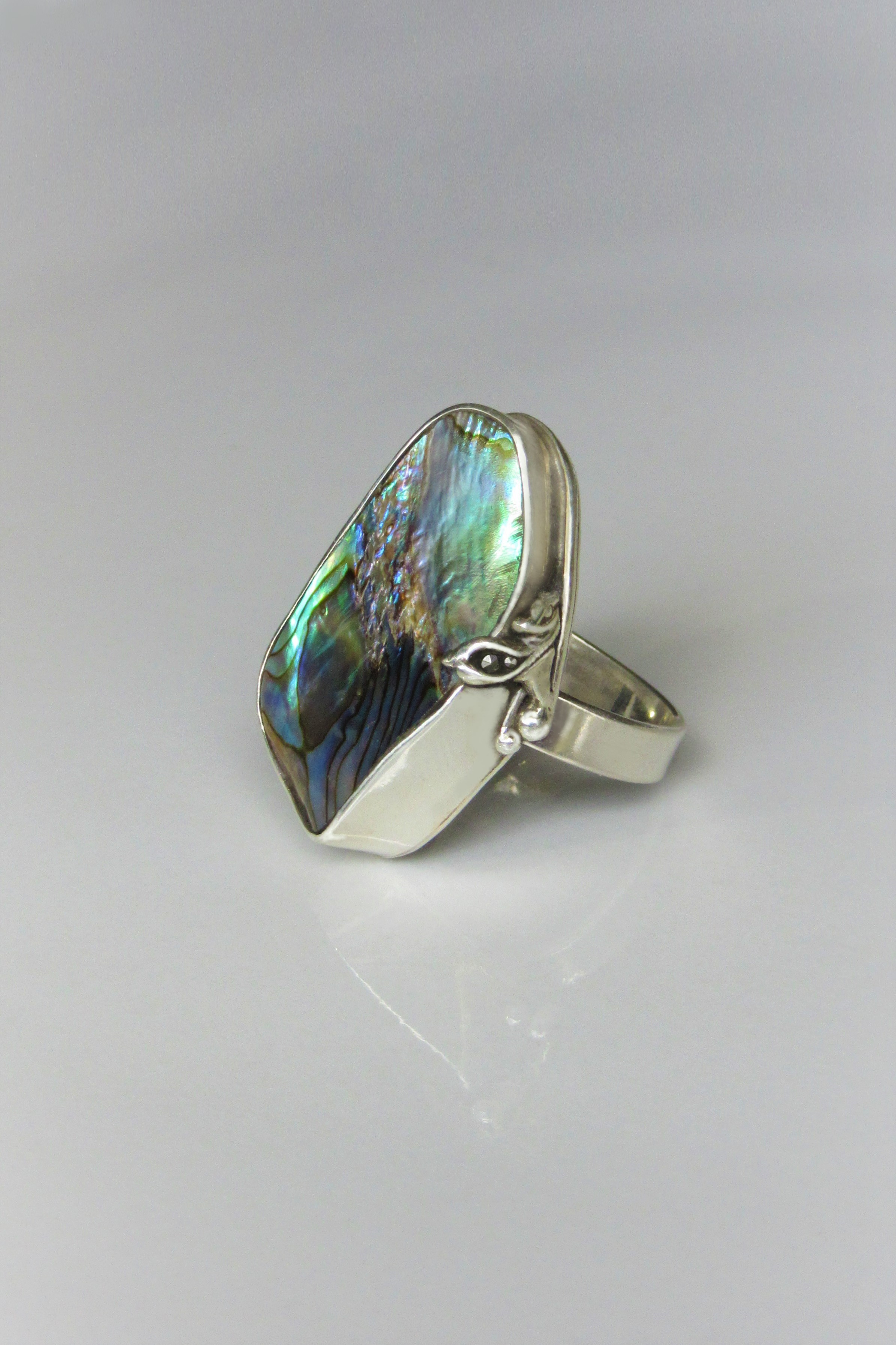 Designed with minimal Sterling Silver ornamentation gracing its side with a single shimmering Marcasite, this handcrafted ring’s sole purpose is to highlight the mesmerizing beauty of the Abalone shell. Absolutely enthralling hues of the clearest sea dance wondrously with the slightest rays of light hitting its wavy surface. An everlasting piece such as this transcends styles and seasons, bringing you eternal elegance that matches perfectly with any imaginable ensemble.