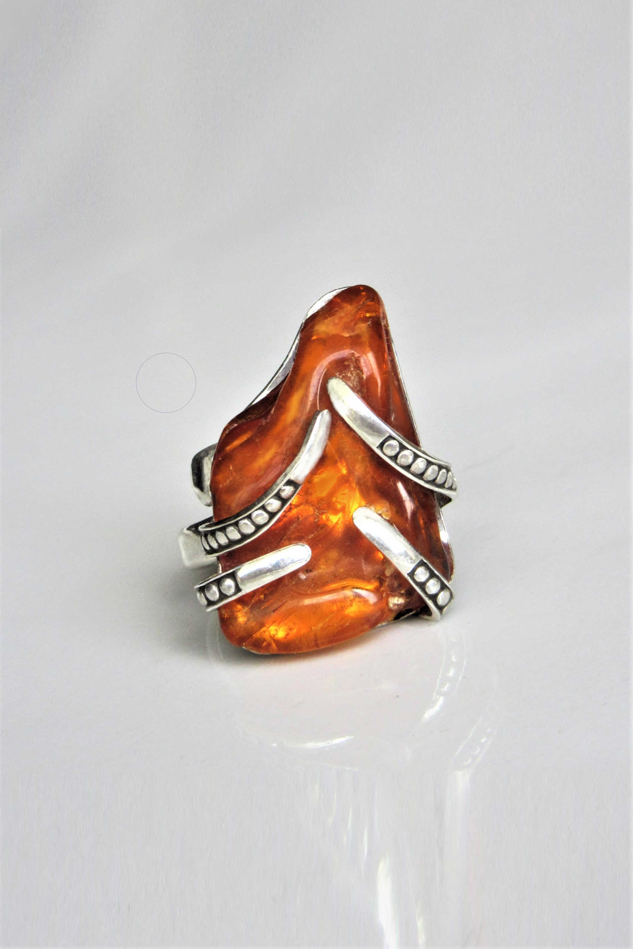 Amber is fossilized tree resin that has been known and appreciated for its mesmerizing color and natural beauty since Neolithic times. Besides its eye-catching appearance, this wondrous material is believed to bring good fortune and relieve stress and anxieties. Subtly ornamented Sterling Silver mimics the flow of the piece, giving it a contemporary aura while simultaneously highlighting the raw, untouched beauty of the Amber. Perfect for those in love with natural materials, this unique ring is a must-have accessory.